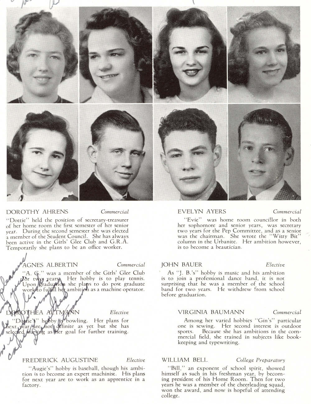 1941 Sheboygan North High School, Page 15: Dorothy Ahrens, Evelyn Ayers, Agnes Albertin, John Bauer, Dorothea Altmann, Virginia Baumann, Frederick Augustine, William Bell.