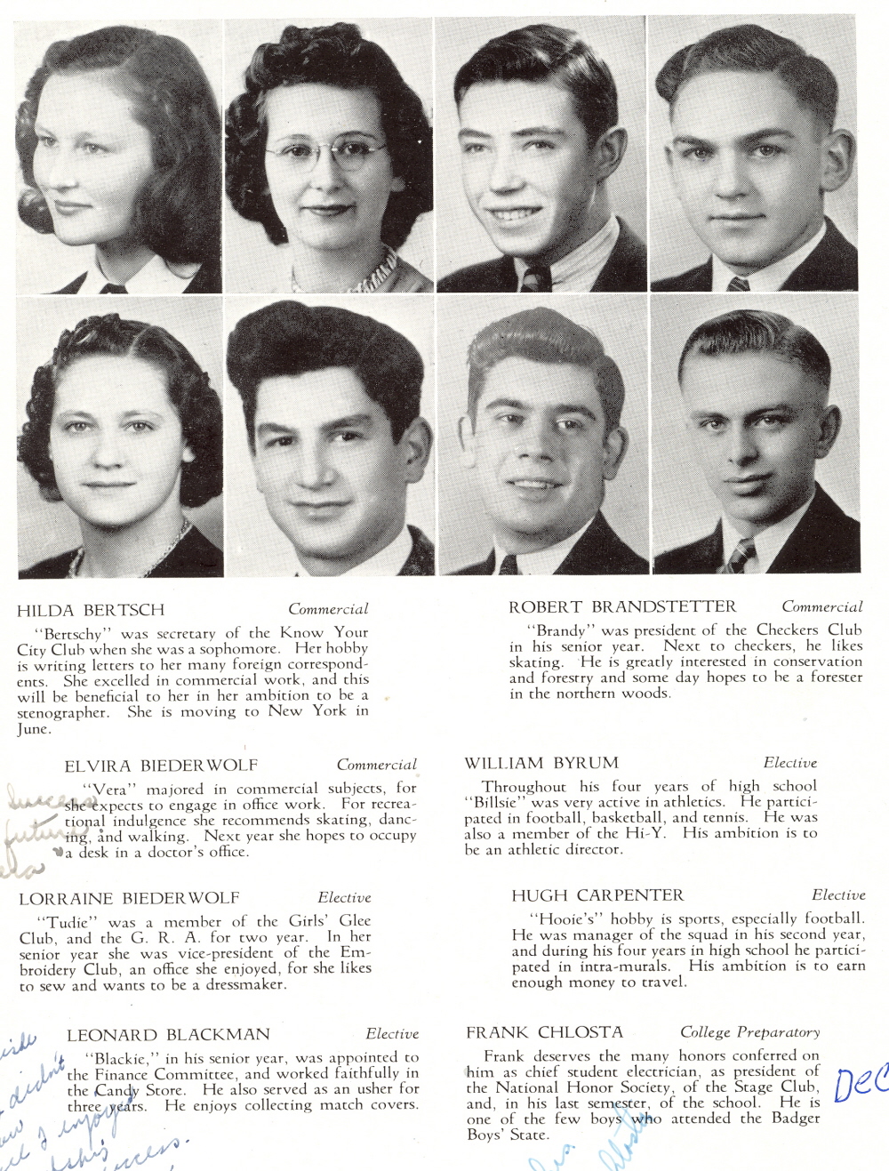 1941 Sheboygan North High School, Page 16: Hilda Bertsch, Robert Brandstetter, Elvira Biederwolf, William Byrum, Lorraine Beiderwolf, Hugh Carpenter, Leonard Blackman, Frank Chlosta.
