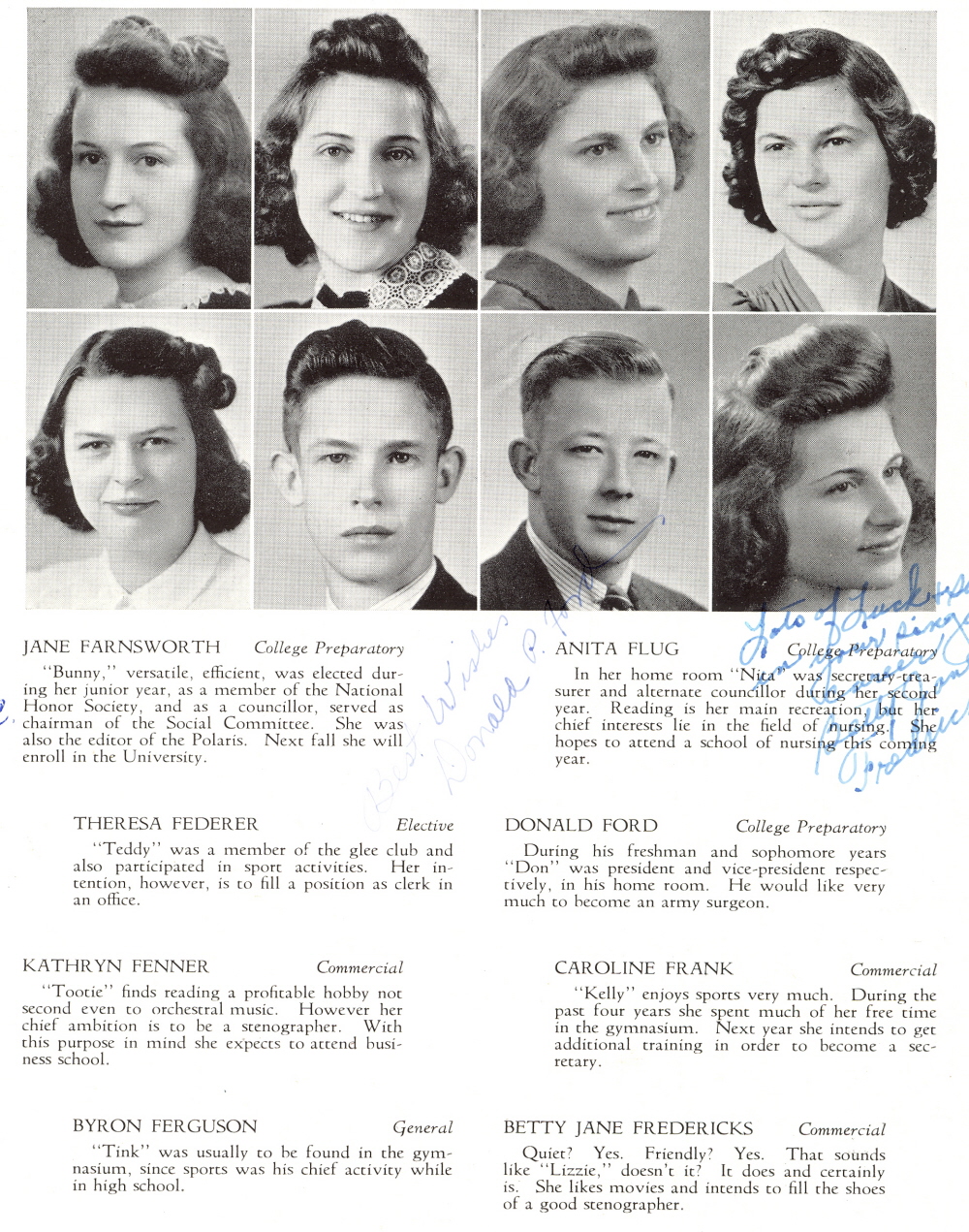 1941 Sheboygan North High School, Page 19: Jane Farnsworth, Anita Flug, Theresa Federer, Donald Ford, Kathryn Fenner, Caroline Frank, Byron Ferguson, Betty Fredericks.