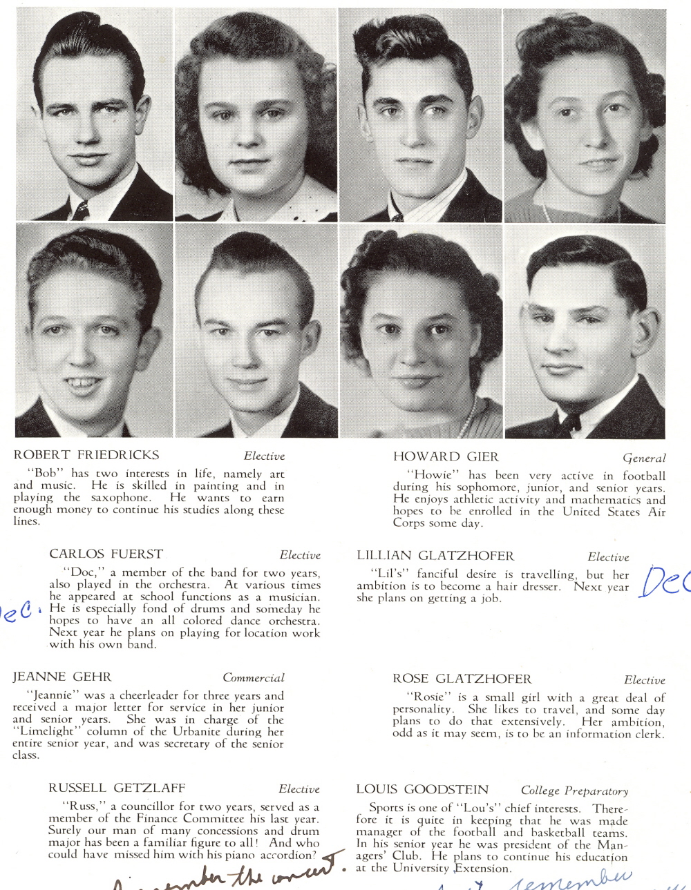 1941 Sheboygan North High School, Page 20: Robert Friedricks, Howard Gier, Carols Fuerst, Lillian Glatzhofer, Jeanne Gehr, Rose Glatzhofer, Russell Getzlaff, Louis Goodstein.