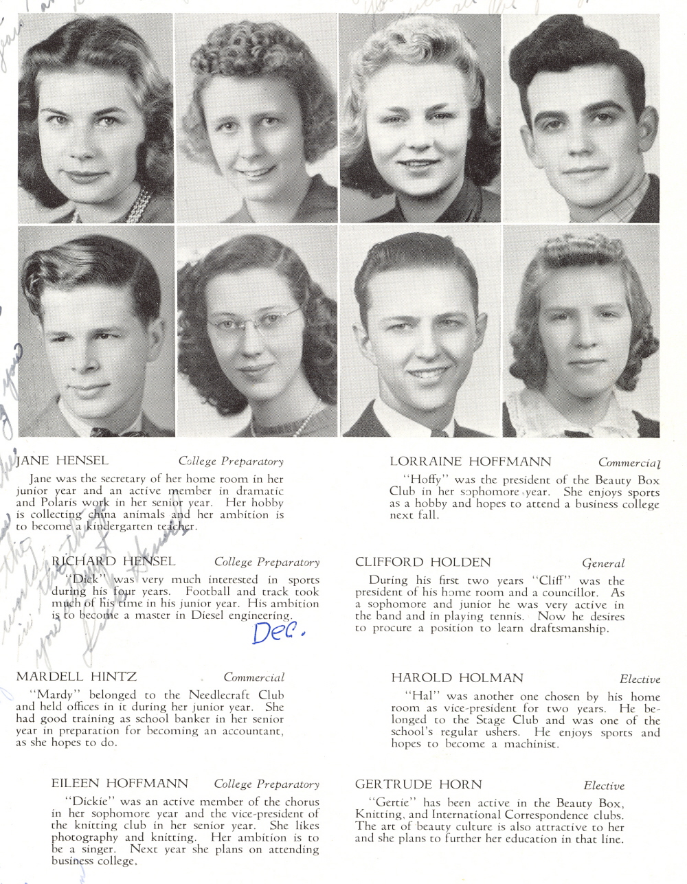 1941 Sheboygan North High School, Page 23: Jane Hensel, Lorraine Hoffmann, Richard Hensel, Clifford Holden, Mardell Hintz, Harold Holman, Eileen Hoffmann, Gertrude Horn.