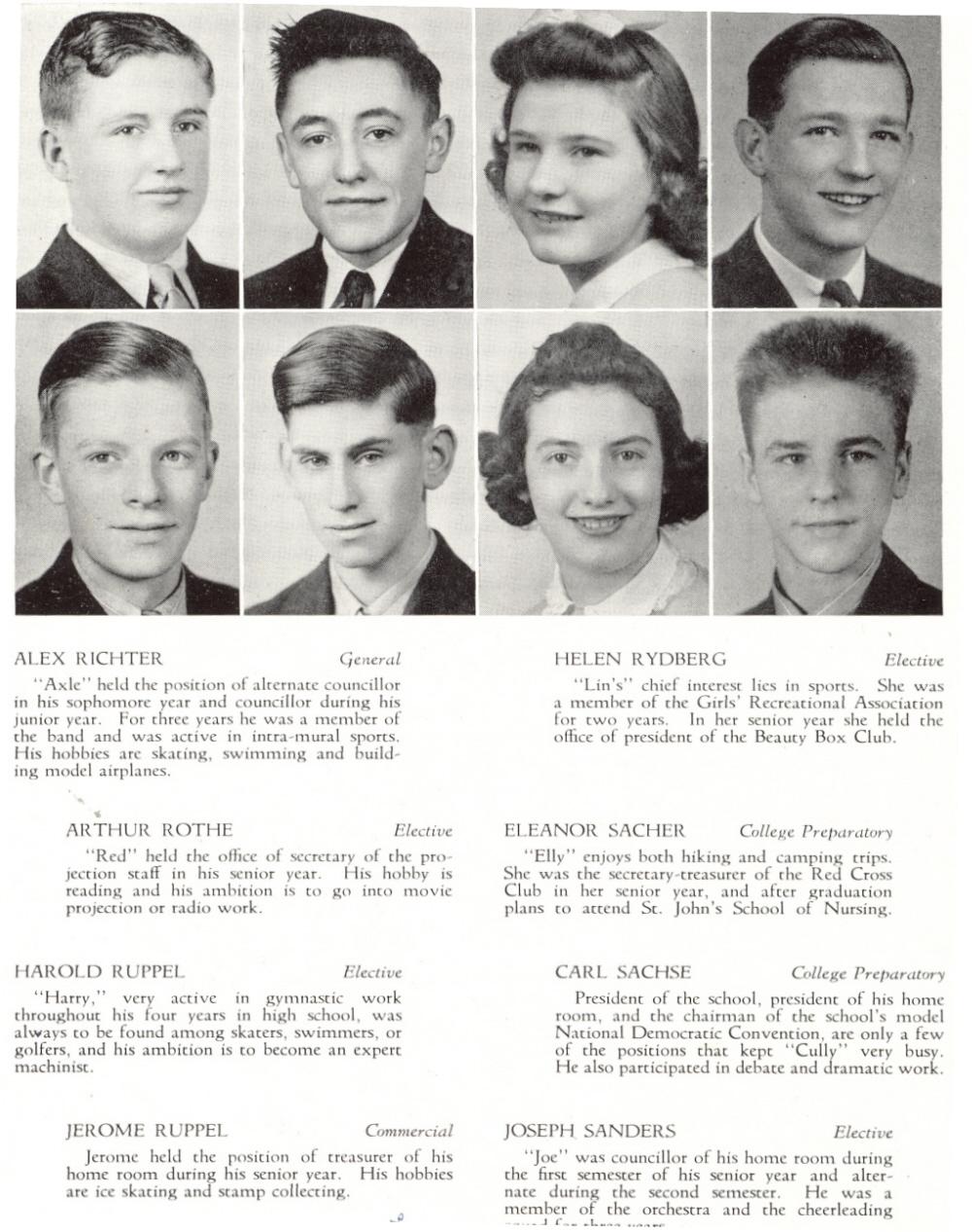 1941 Sheboygan North High School, Page 32: Alex Richter, Helen Rydberg, Arthur Rothe, Eleanor Sacher, Harold Ruppel, Carl Sachse, Jerome Ruppel, Joseph Sanders.