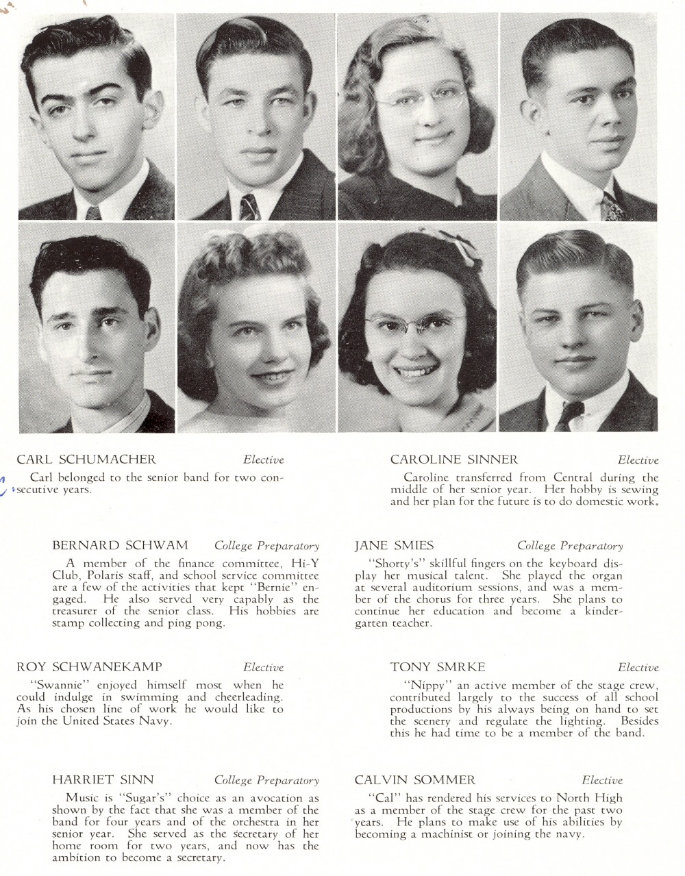 1941 Sheboygan North High School, Page 34: Carl Schumacher, Caroline Sinner, Bernard Schwam, Jane Smies, Roy Schwanekamp, Tony Smrke, Harriet Sinn, Calvin Sommer.