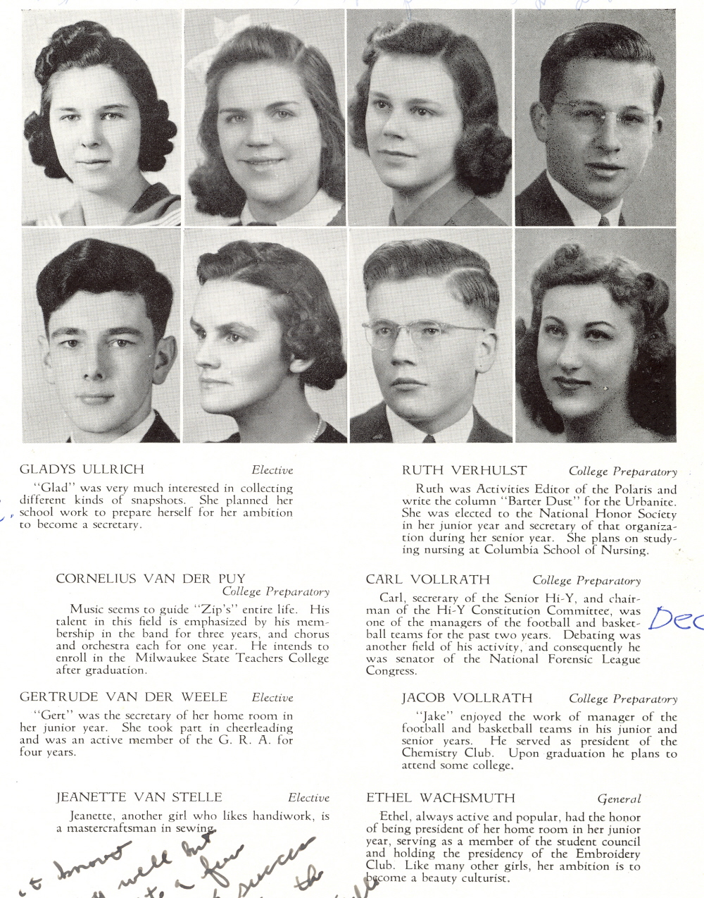 1941 Sheboygan North High School, Page 37: Gladys Ullrich, Ruth Verhulst, Cornelius Van Der Puy, Carl Vollrath, Gertrude Van Der Weele, Jacob Vollrath, Jeanette Van Stelle, Ethel Washsmuth.