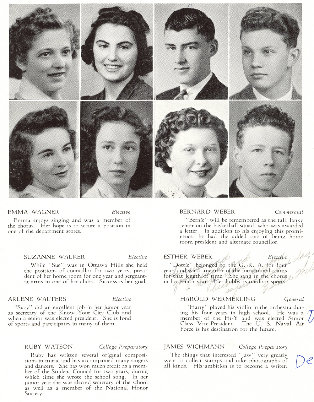 1941 Sheboygan North High School, Page 38: Emma Wagner, Bernard Weber, Suzanne Walker, Esther Weber, Arlene Walters, Harold Wermerling, Ruby Watson, James Wichmann.