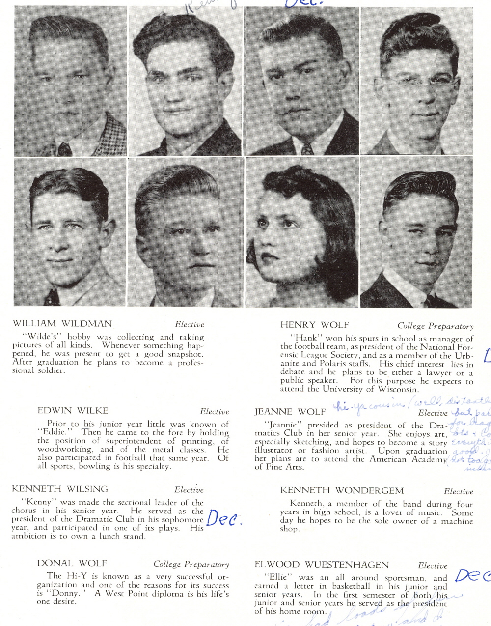 1941 Sheboygan North High School, Page 39: William Wildman, Henry Wolf, Edwin Wilke, Jeanne Wolf, Kenneth Wilsing, Kenneth Wondergem, Donal Wolf, Elwood Wuestenhagen.