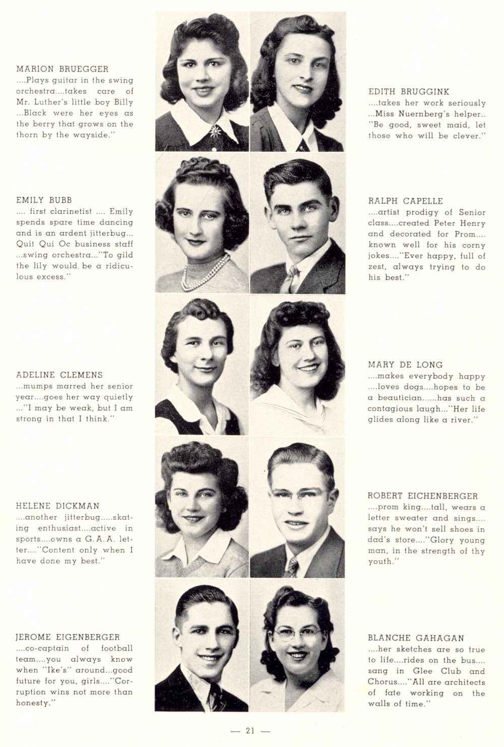 1942 Plymouth High School, Page 21: Marion Bruegger, Edith Bruggink, Emily Bubb, Ralph Capelle, Adeline Clemens, Mary De Long, Helene Dickman, Robert Eichenberger, Jerome Eigenberger, Blanche Gahagan.