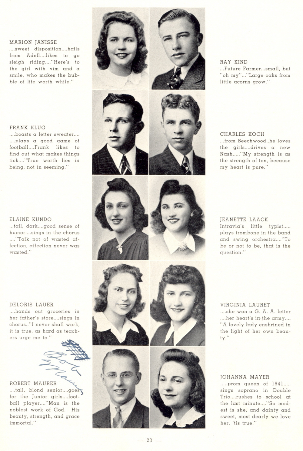 1942 Plymouth High School, Page 23: Marion Janisse, Ray Kind, Frank Klug, Charles Koch, Elaine Kundo, Jeanete Laack, Deloris Lauer, Virginia Lauret, Robert Maurer, Johanna Mayer.