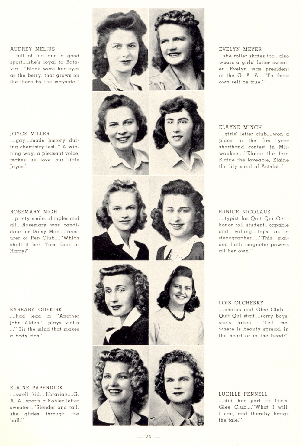 1942 Plymouth High School, Page 24: Audrey Melius, Evelyn Meyer, Joyce Miller, Elayne Minch, Rosemary Nigh, Eunice Nicolaus, Barbara Odekirk, Lois Olcheskey, Elaine Papendick, Lucille Pennell.