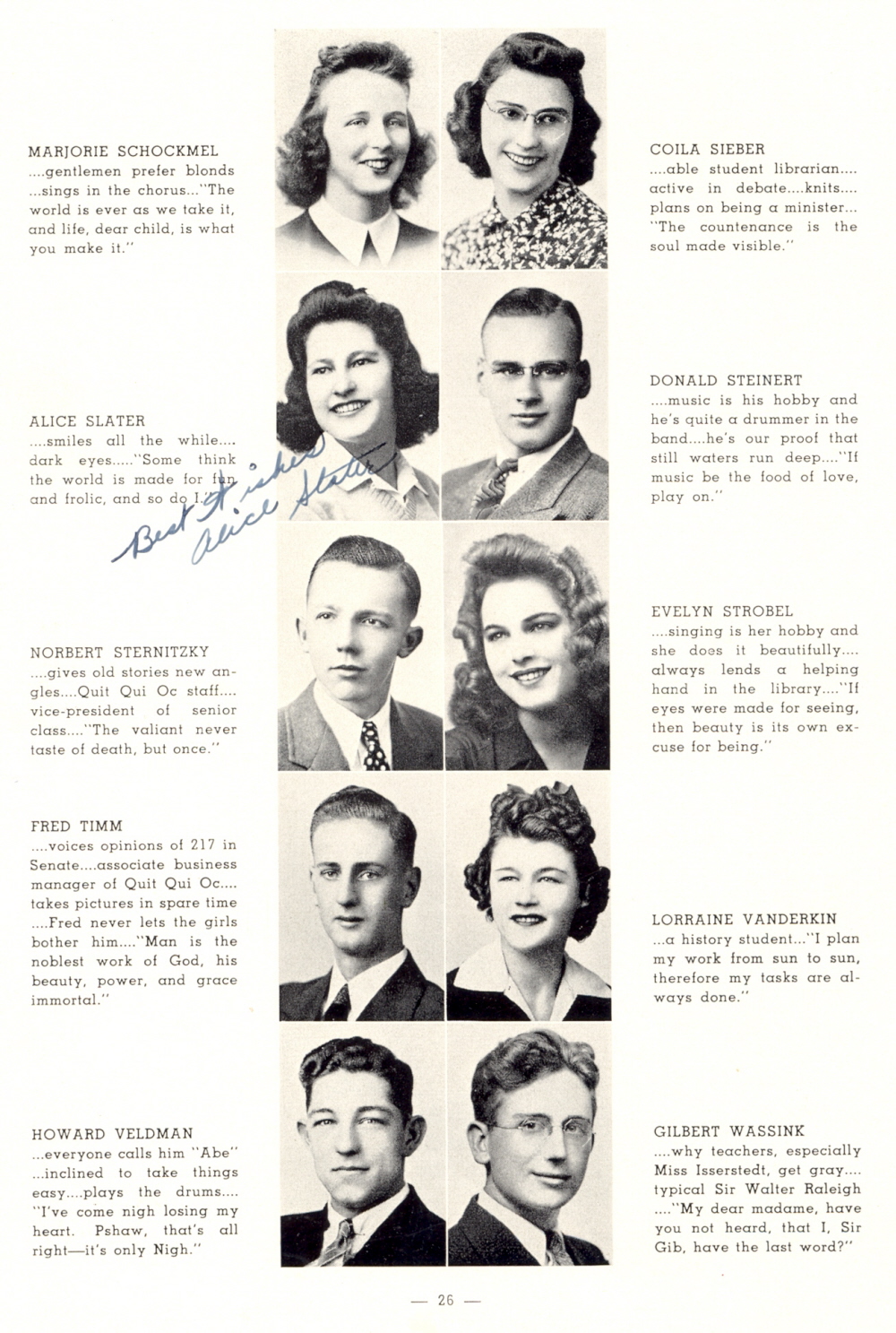 1942 Plymouth High School, Page 26: Marjorie Schockmel, Coila Sieber, Alice Slater, Donald Steinert, Norbert Sternitzky, Evelyn Strobel, Fred Timm, Lorraine Vanderkin, Howard Veldman, Gilbert Wassink.