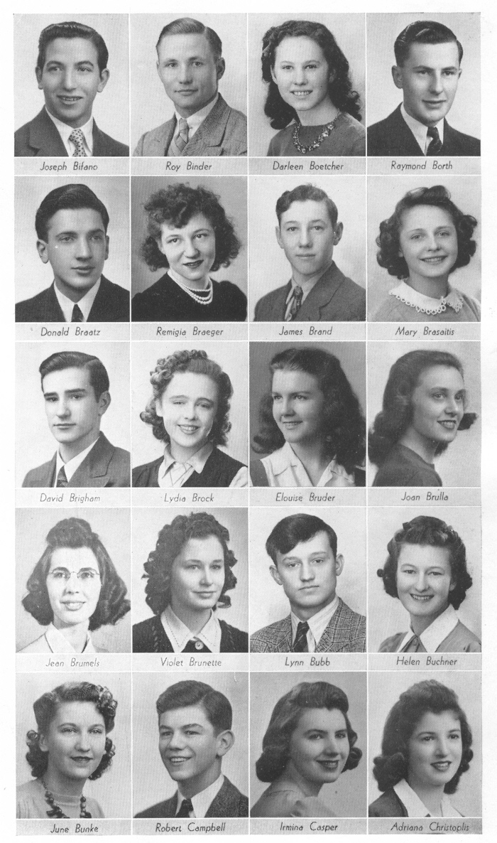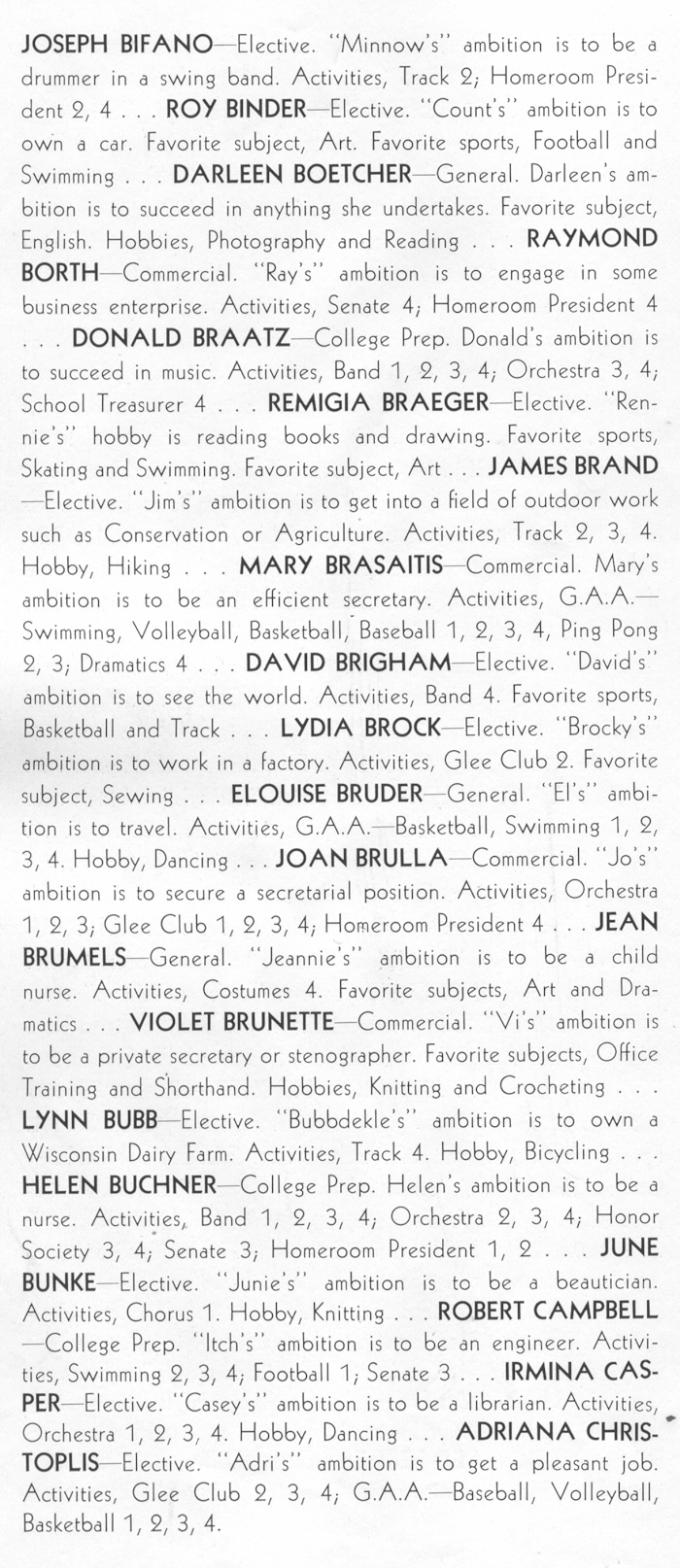 1942 Sheboygan Central High School, Pages 58 and 59: Joseph Bifano, Roy Binder, Darleen Boetcher, Raymond Borth, Donald Braatz, Remigia Braeger, James Brand, Mary Brasaitis, David Brigham, Lydia Brock, Elouise Bruder, Joan Brulla, Jean Brumels, Violet Brunette, Lynn Bubb, Helen Buchner, June Bunke, Robert Campbell, Irmina Casper, Adriana Christoplis.