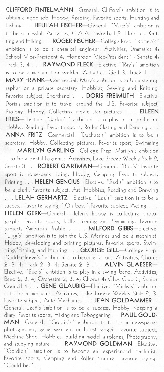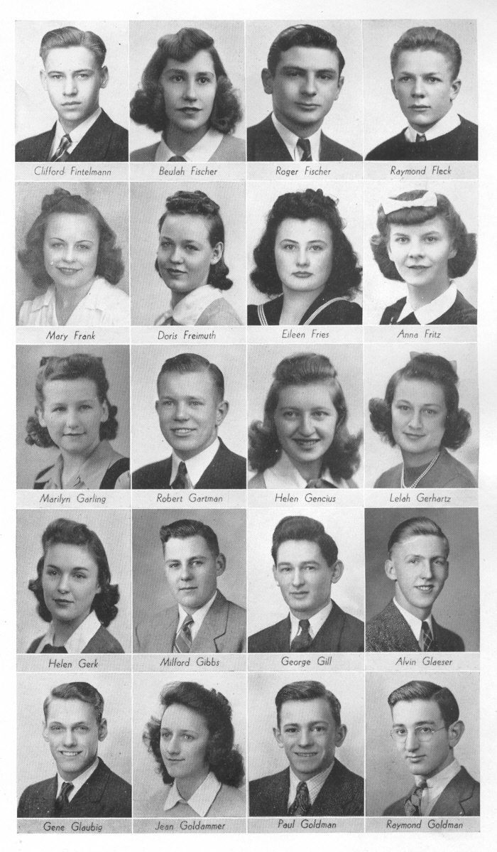 1942 Sheboygan Central High School, Pages 62 and 63: Clifford Fintelmann, Beulah Fischer, Roger Fischer, Raymond Fleck, Mary Frank, Doris Freimuth, Eileen Fries, Anna Fritz, Marilyn Garling, Robert Gartman, Helen Gencius, lelah Gerhartz, Helen Gerk, Milford Gibbs, George Gill, Alvin Glaeser, Gene Glaubig, Jean Goldammer, Paul Goldman, Raymond Goldman.