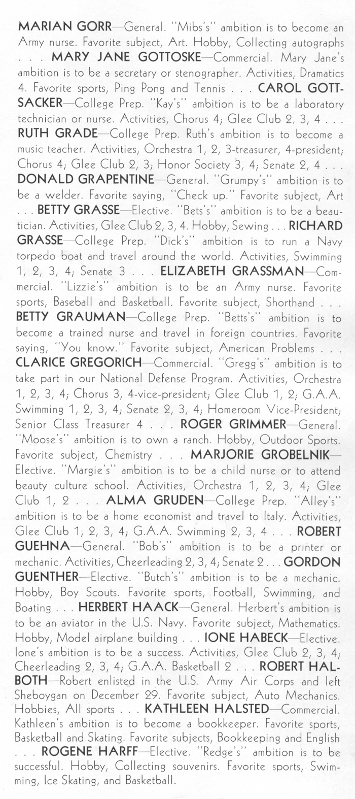 1942 Sheboygan Central High School, Pages 64 and 65: Marian Gorr, Mary Gottoske, Carol Gottsacker, Ruth Grade, Donald Grapentine, Betty Grasse, Richard Grasse, Elizabeth Grassman, Betty Grauman, Clarice Gregorich, Roger Grimmer, Marjorie Grobelnik, Alma Gruden, Robert Guehna, Gordon Guenther, Herbert Haack, Ione Habeck, Robert Halboth, Kathleen Halsted, Rogene Harff.