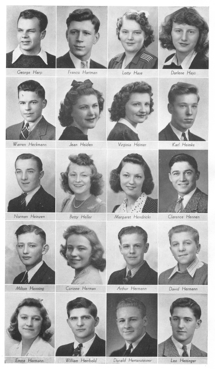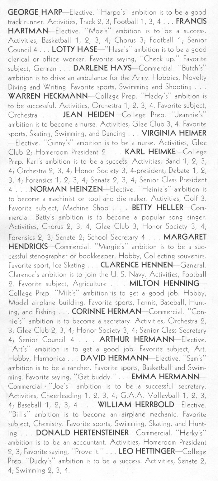1942 Sheboygan Central High School, Pages 66 and 67: George Harp, Francis Hartman, Lotty Hase, Darlene Hays, Warren Heckmann, Jean Heiden, Virginia Heimer, Karl Heimke, Norman Heinzen, Betty Heller, Margaret Hendricks, Clarence Hennen, Milton Henning, Corinne Herman, Arthur Hermann, David Hermann, Emma Hermann, William Herrbold, Donald Hertensteiner, Leo Hettinger.