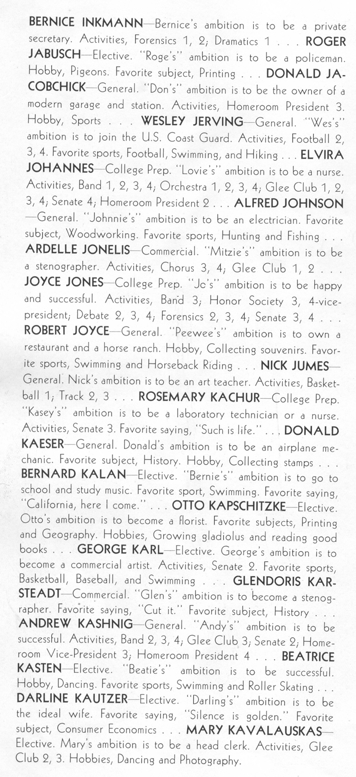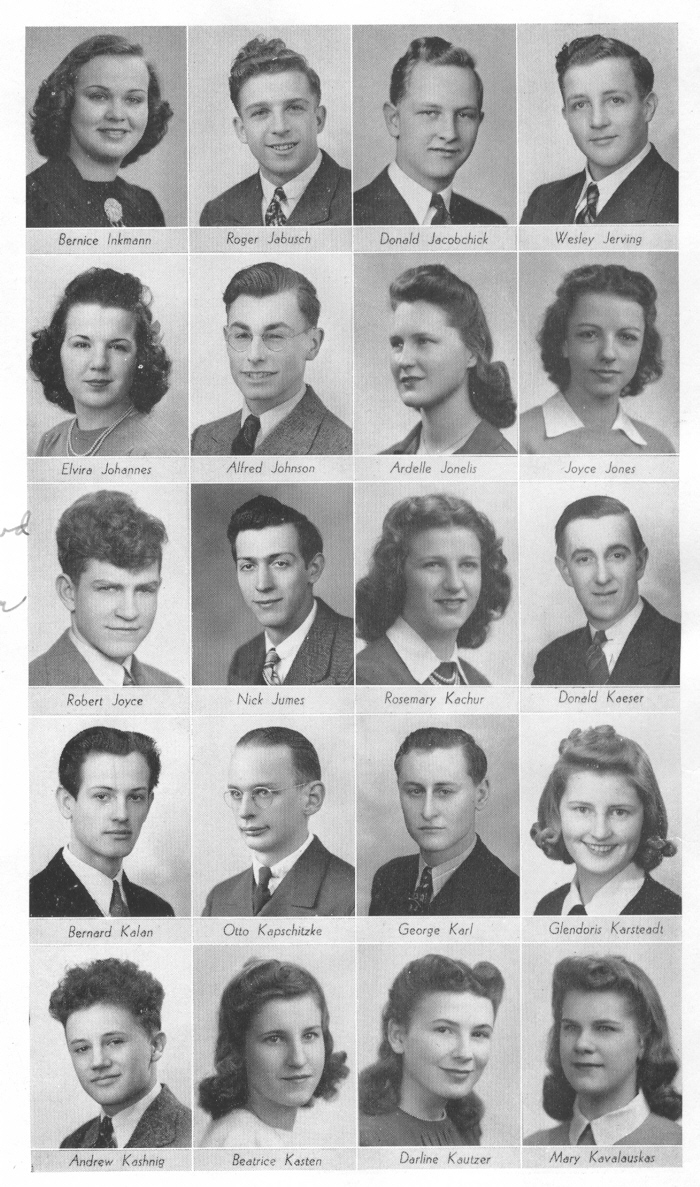 1942 Sheboygan Central High School, Pages 70 and 71: Bernice Inkmann, Roger Jabusch, Donald Jacobchick, Wesley Jerving, Elvira Johannes, Alfred Johnson, Ardelle Jonelis, Joyce Jones, Robert Joyce, Nick Jumes, Rosemary Kachur, Donald Kaeser, Bernard Kalan, Otto Kapschitzke, George Karl, Glendoris Karsteadt, Andrew Kashnig, Beatrice Kasten, Darlene Kautzer, Mary Kavalauskas.