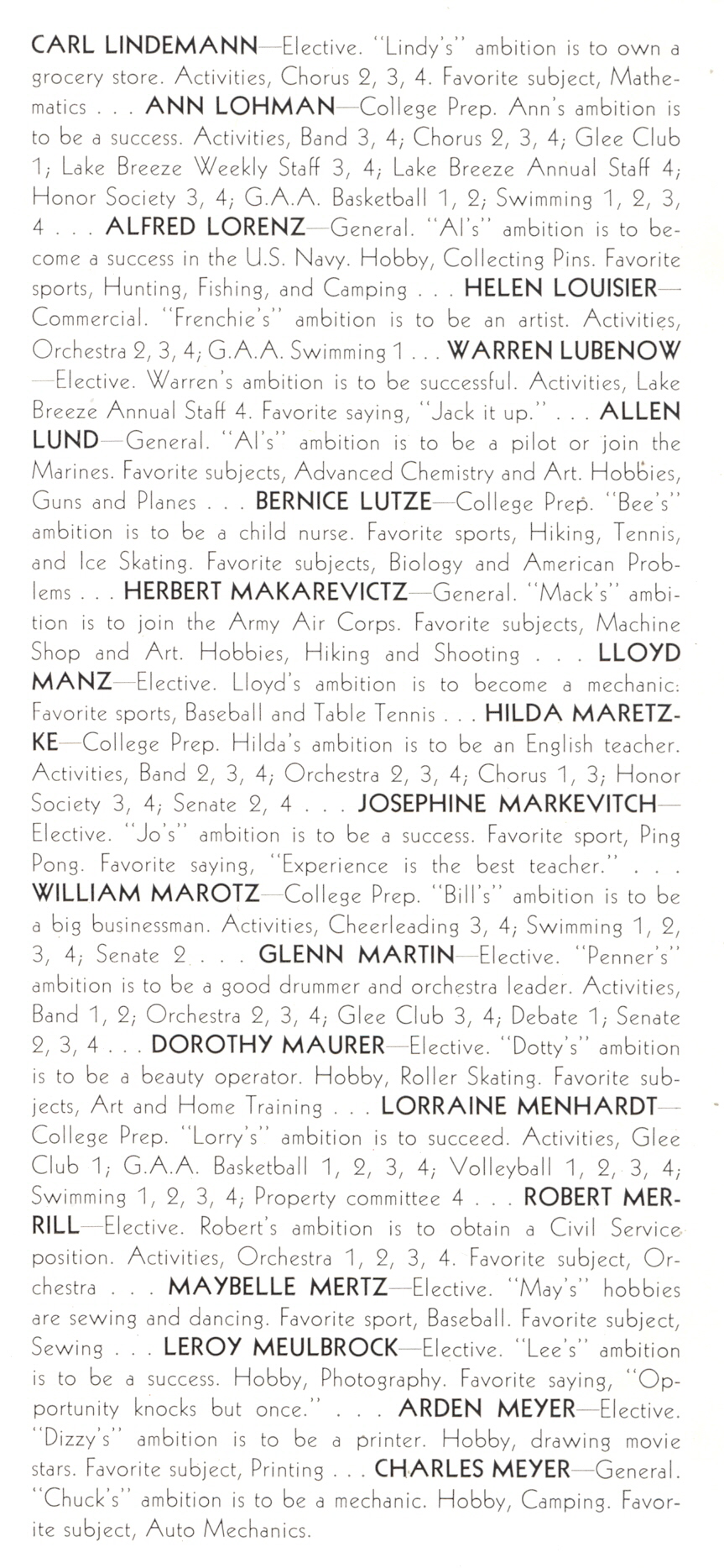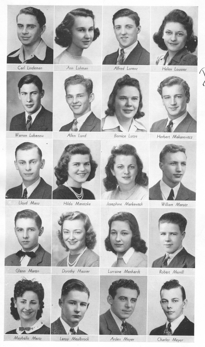 1942 Sheboygan Central High School, Pages 76 and 77: Carl Lindemann, Ann Lohman, Alfred Lorenz, Helen Louisier, Warren Lubenow, Allen Lund, Bernice Lutze, Herbert Makarevictz, Lloyd Manz, Hilda Maretzke, Josephine Markevitch, William Marotz, Glenn Martin, Dorothy Mauer, Lorraine Menhardt, Robert Merrill, Maybelle Mertz, Leroy Meulbrock, Arden Meyer, Charles Meyer.