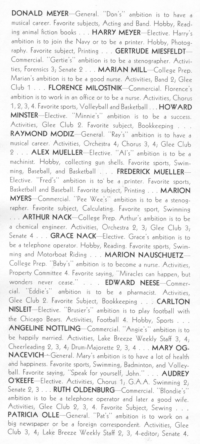 1942 Sheboygan Central High School, Pages 78 and 79: Donald Meyer, Harry Meyer, Gertrude Miesfeldt, Marian Mill, Florence Milostnik, Howard Minster, Raymond Modiz, Alex Mueller, Frederick Mueller, Marion Myers, Arthur Nack, Grace Nack, Marion Nauschuetz, Edward Neese, Carlton Nisleit, Angeline Nottling, Mary Ognacevich, Audrey O'Keefe, Ruth Oldenburg, Patricia Olle.