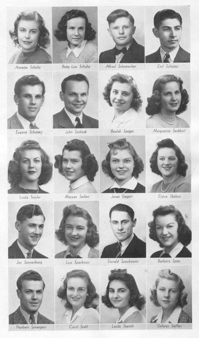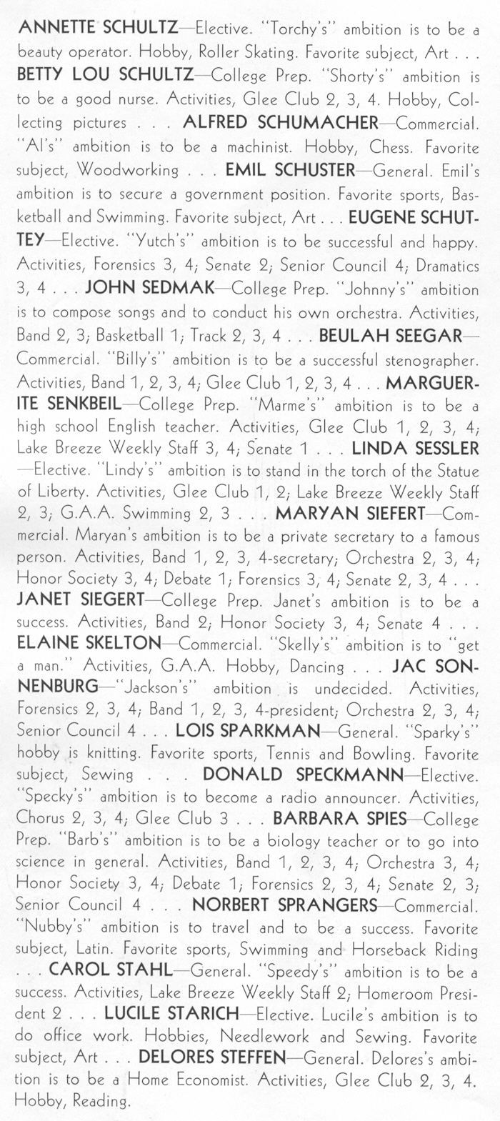 1942 Sheboygan Central High School, Pages 86 and 87: Annette Schultz, Betty Schultz, Alfred Schumacher, Emil Schuster, Eugene Schuttey, John Sedmak, Beulah Seegar, Marguerite Senkbeil, Linda Sessler, Maryan Siefert, Janet Siegert, Elaine Skelton, Jac Sonnenburg, Lois Sparkman, Donald Speckmann, Barbara Spies, Norbert Sprangers, Carol Stahl, Lucile Starich, Delores Steffen.