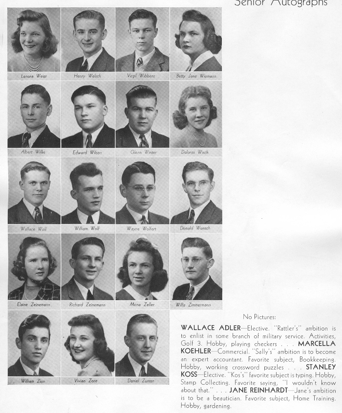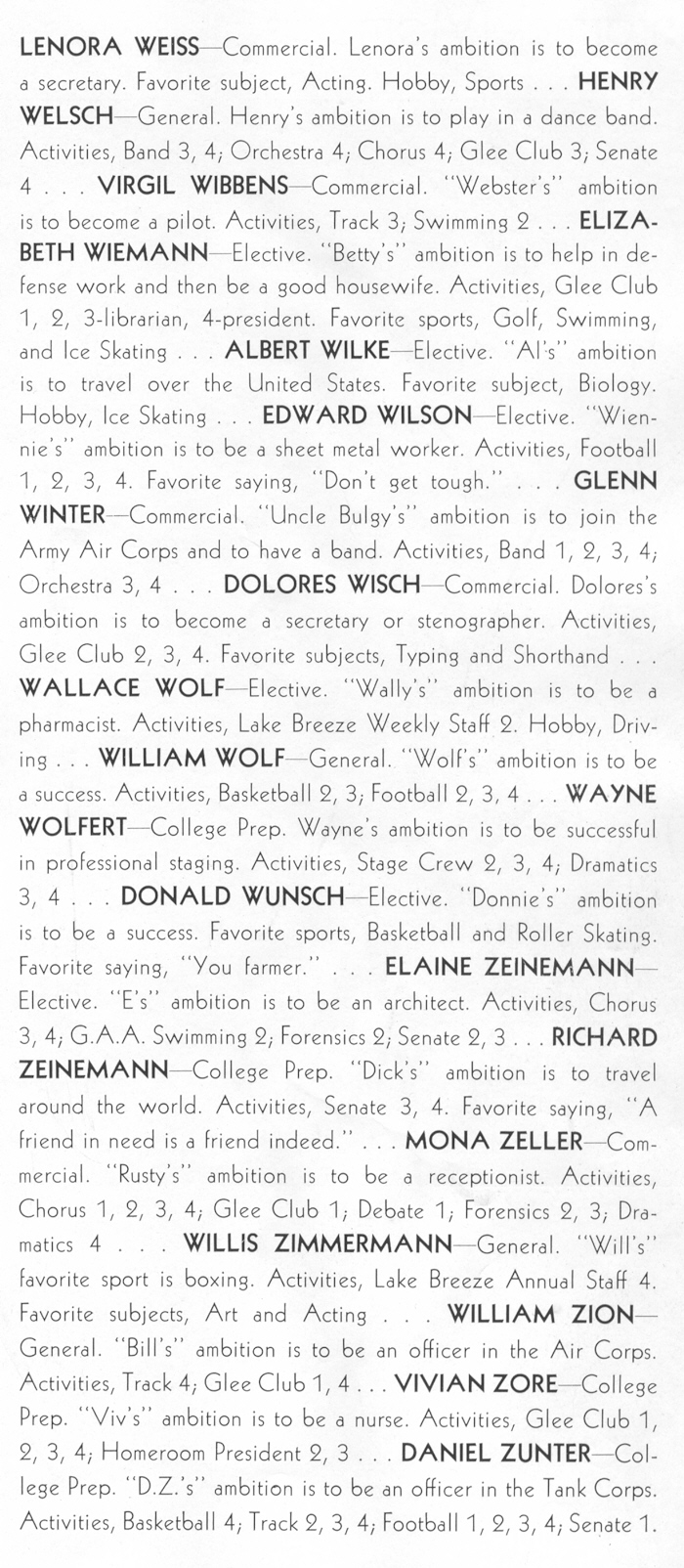 1942 Sheboygan Central High School, Pages 92 and 93: Wallace Adler, Marcella Koehler, Stanley Koss, Jane Reinhardt, Lenora Weiss, Henry Welsch, Virgil Wibbens, Elizabeth Wiemann, Albert Wilke, Edward Wilson, Glenn Winter, Dolores Wisch, Wallace Wolf, William Wolf, Wayne Wolfert, Donald Wunsch, Elaine Zeinemann, Richard Zeinemann, Mona Zeller, Willis Zimmermann, William Zion, Vivian Zore, Daniel Zunter.