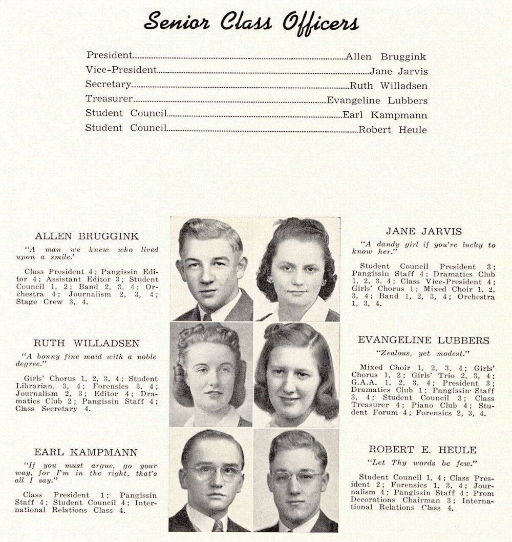 1942 Sheboygan Falls High School, Page 17: Allen Bruggink, Jane Jarvis, Ruth Willadsen, Evangeline Lubbers, Earl Kampmann, Robert Heule.