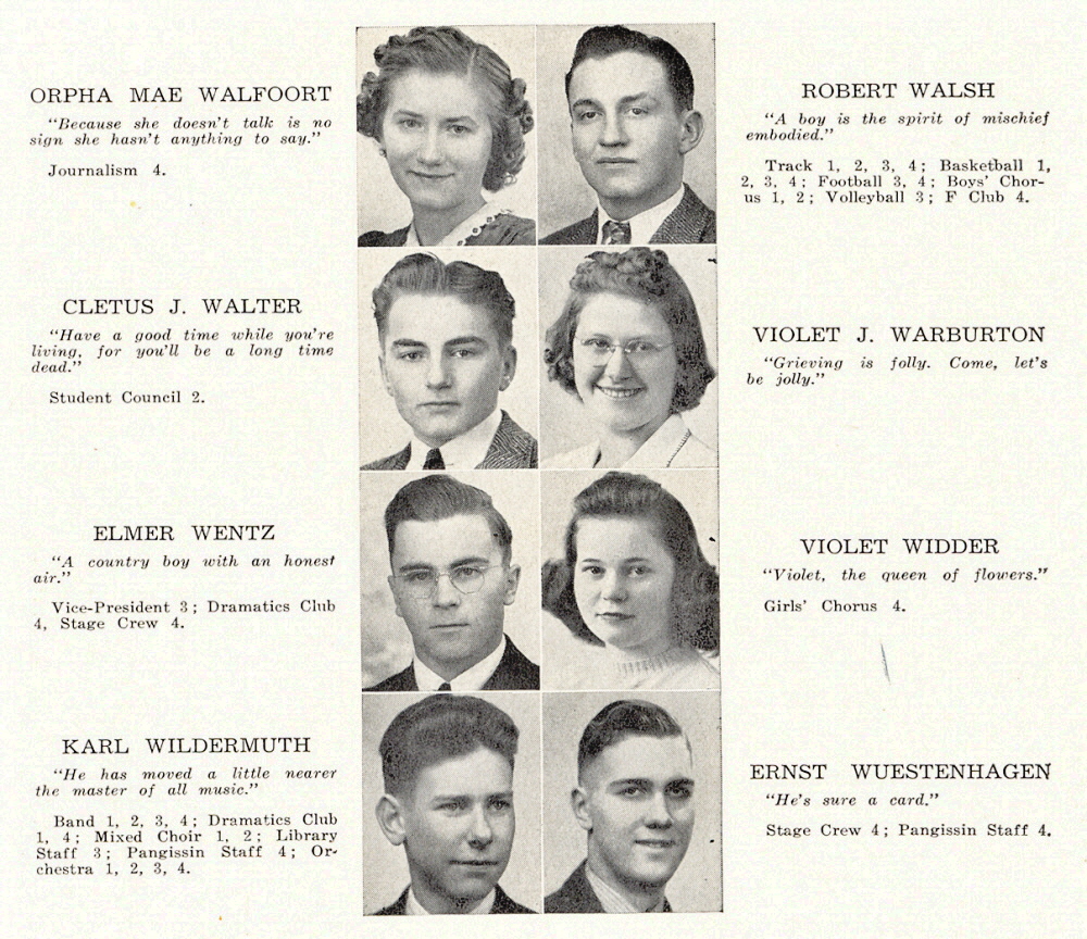1942 Sheboygan Falls High School, Page 22: Orpha Mae Walfoort, Robert Walsh, Cletus Walter ,Violet Warburton, Elmer Wentz, Violet Widder, Karl Wildermuth, Ernst Wuestenhagen.