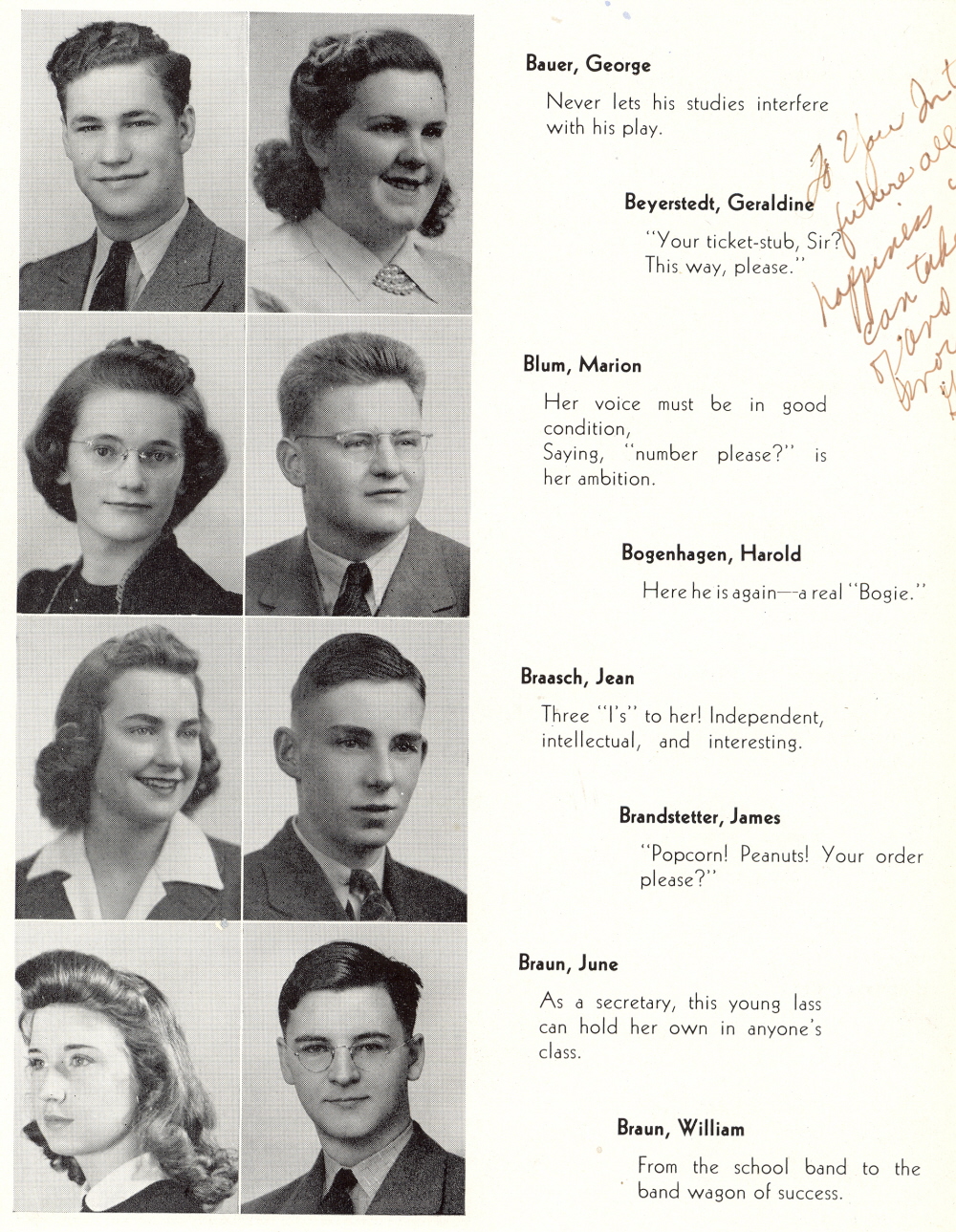 1942 Sheboygan North High School, Page 20: George Bauer, Geraldine Beyerstedt, Marion Blum, Harold Bogenhagen, Jean Braasch, James Brandstetter, June Braun, William Braun.