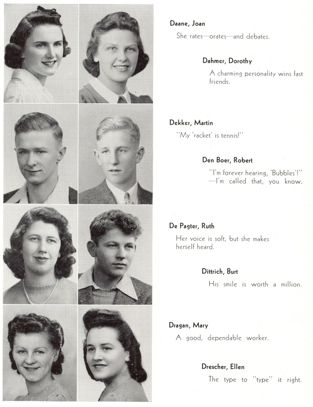 1942 Sheboygan North High School, Page 22: Joan Daane, Dorothy Dahmer, Martin Dekker, Robert Den Boer, Ruth De Pagter, Burt Dittrich, Mary Dragan, Ellen Drescher.