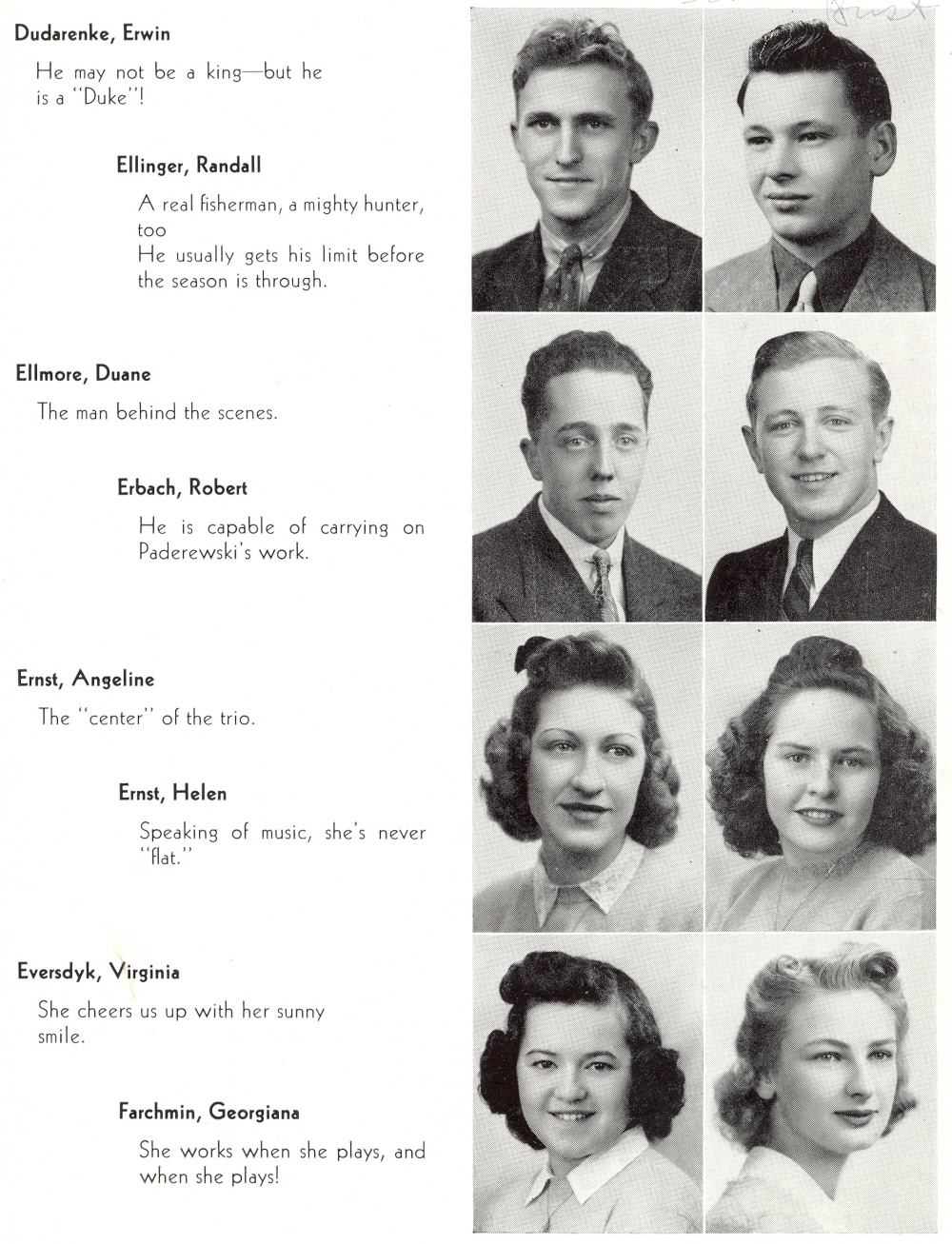1942 Sheboygan North High School, Page 23: Erwin Dudarenke, Randall Ellinger, Duane Ellmore, Robert Erbach, Angeline Ernst, Helen Ernst, Virginia Eversdyk, Georgiana Farchmin.
