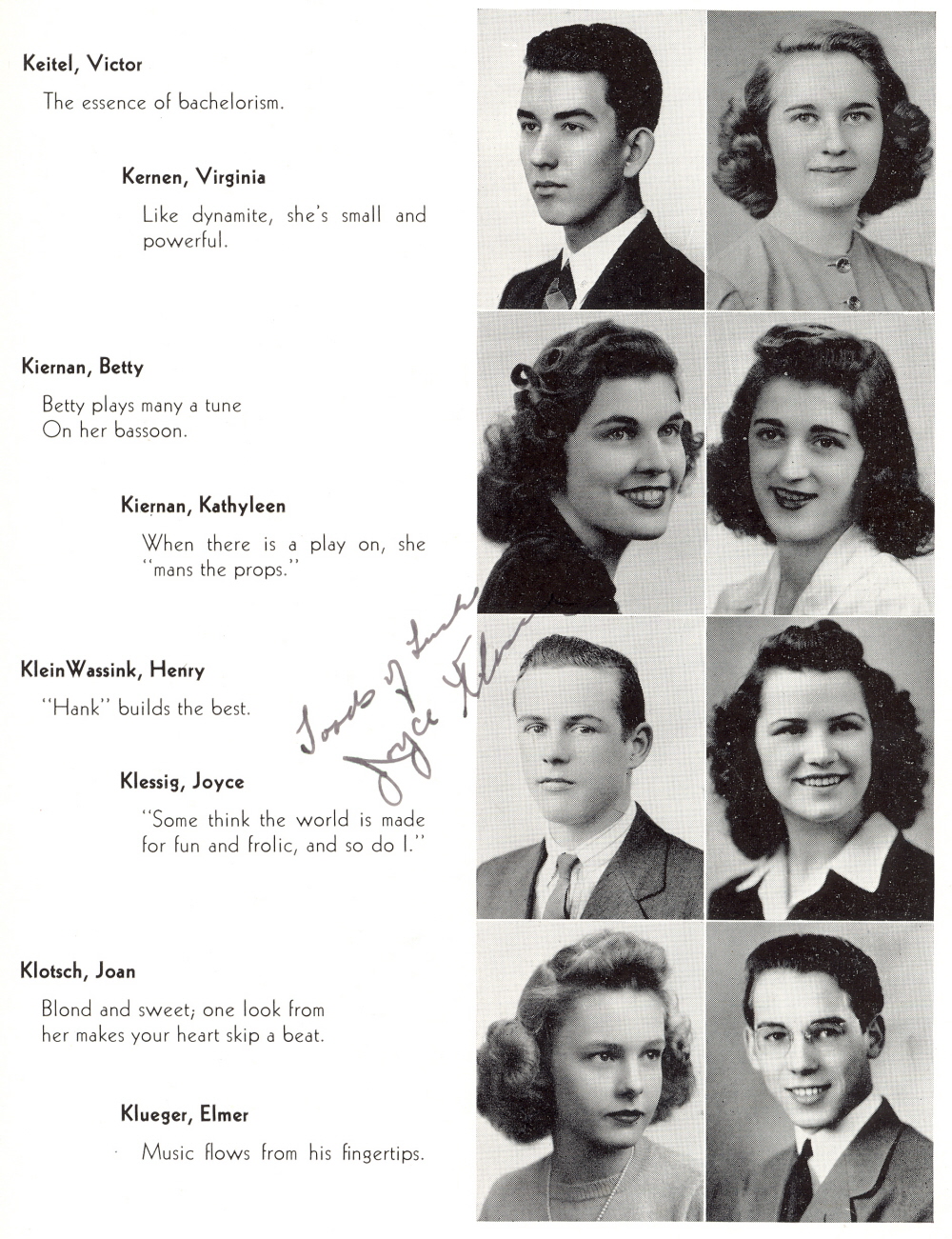 1942 Sheboygan North High School, Page 29: Victor Keitel, Virginia Kernen, Betty Kiernan, Kathyleen Kiernan, Henry Klein Wassink, Joyce Klessig, Joan Klotsch, Elmer Klueger.