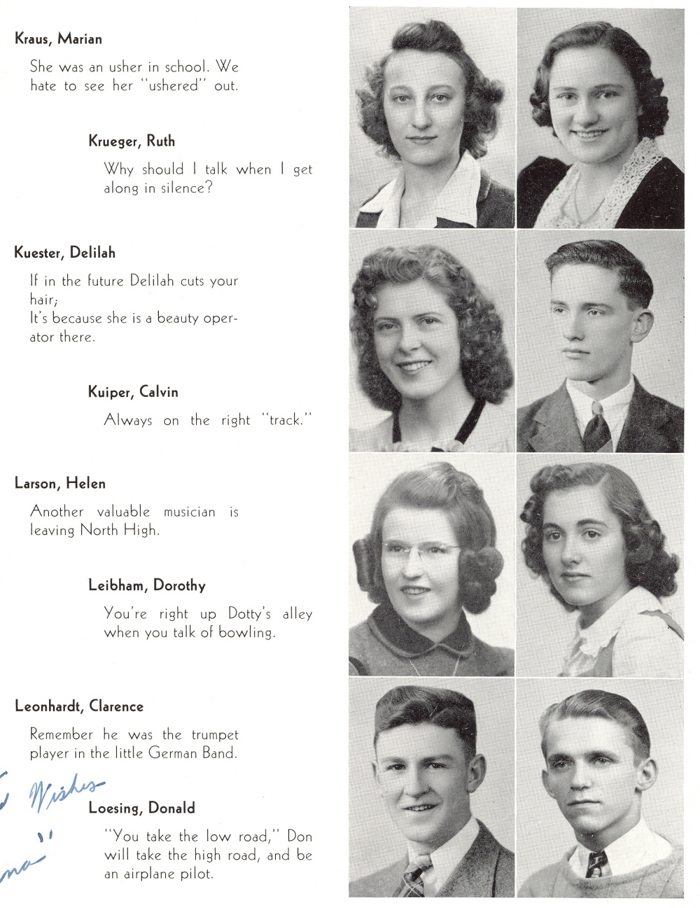 1942 Sheboygan North High School, Page 31: Marian Kraus, Ruth Krueger, Delilah Kuester, Calvin Kuiper, Helen Larson, Dorothy Leibham, Clarence Leonhardt, Donald Loesing.