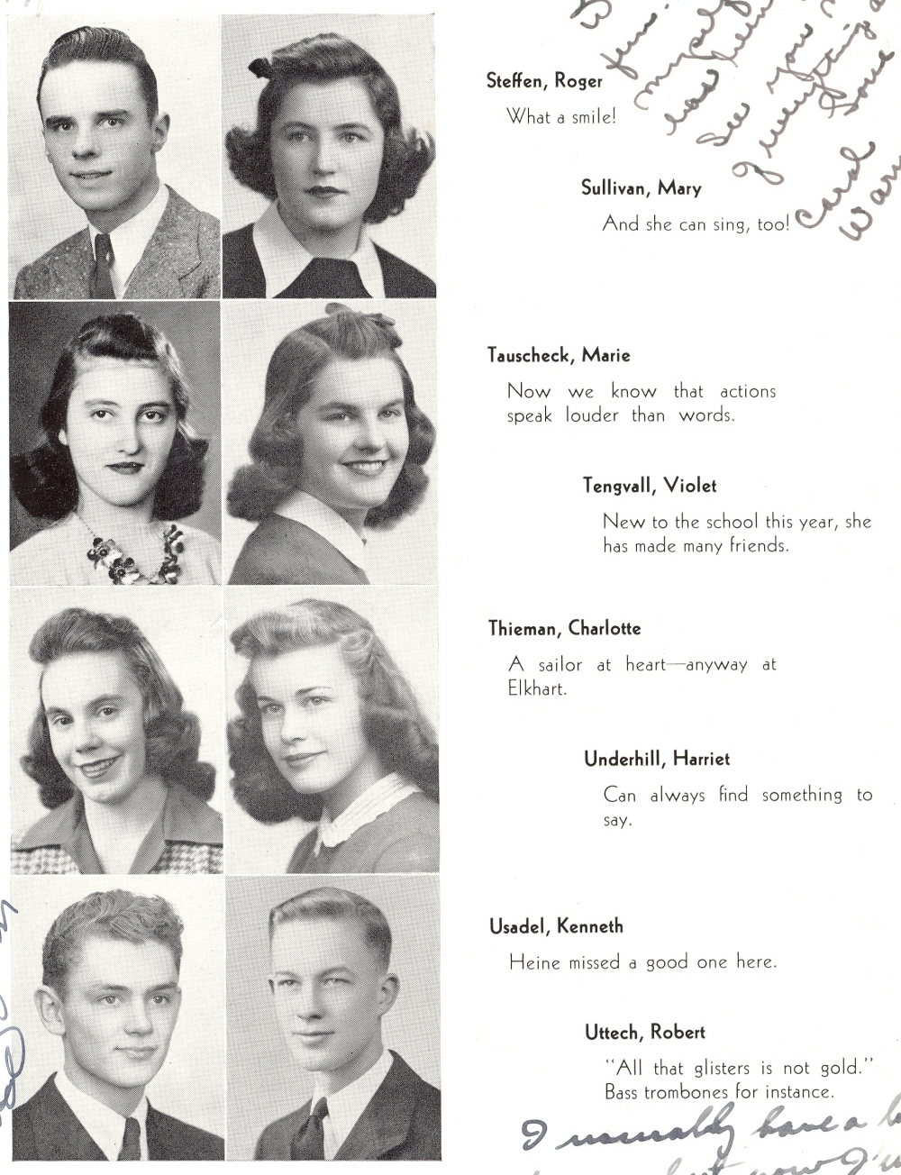 1942 Sheboygan North High School, Page 40: Roger Steffen, Mary Sullivan, Marie Tauscheck, Violet Tengvall, Charlotte Thieman, Harriet Underhill, Kenneth Usadel, Robert Uttech.