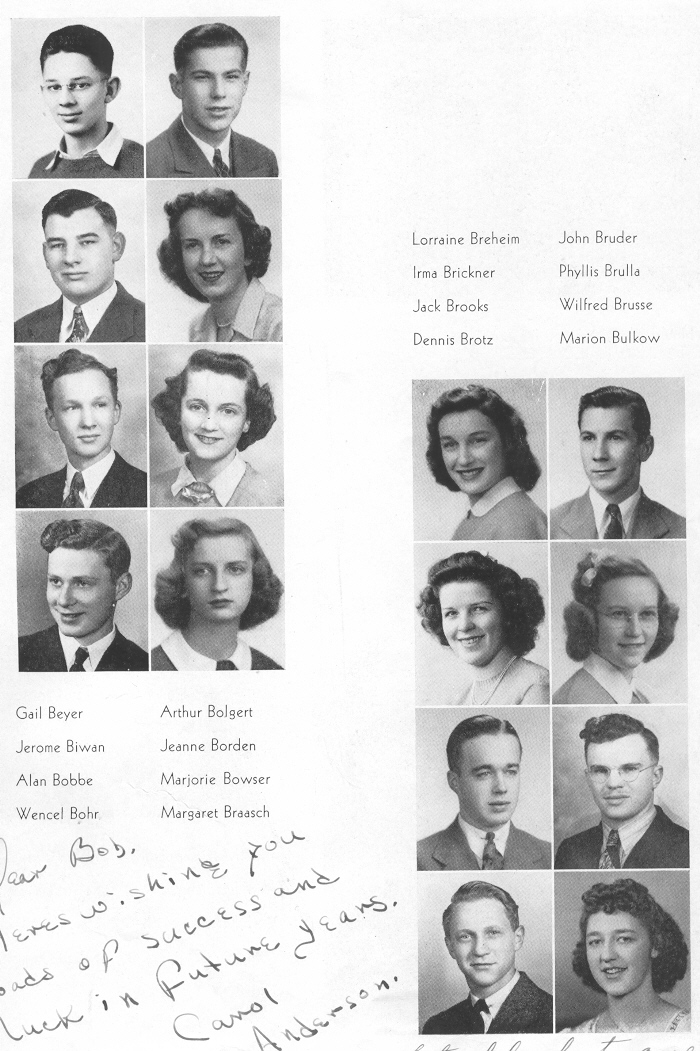 1943 Sheboygan Central High School, Page 69: Gail Beyer, Jerome Biwan, Alan Bobbe, Wencel Bohr, Arthur Bolgert, Jeanne Borden, Marjorie Bowser, Margaret Braasch, Lorraine Breheim, Irma Brickner, Jack Brooks, Dennis Brotz, John Bruder, Phyllis Brulla, Wilfred Brusse, Marion Bulkow.