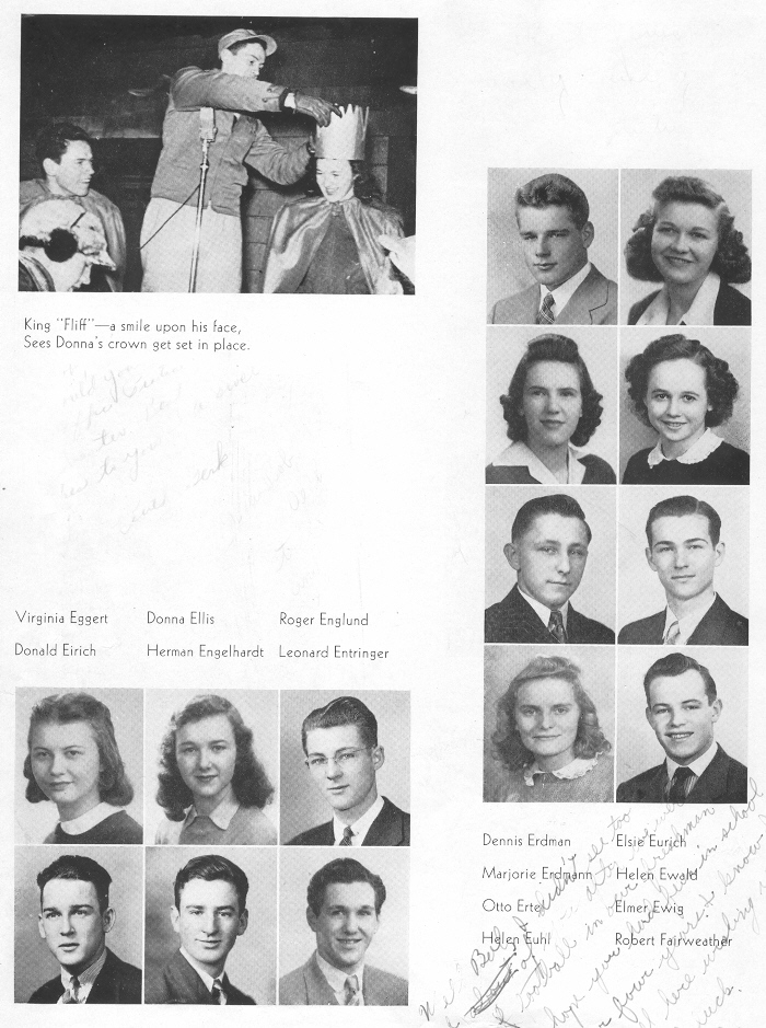 1943 Sheboygan Central High School, Page 72: Virginia Eggert, Donald Eirich, Donna Ellis, Herman Engelhardt, Roger Englund, Leonard Entringer, Dennis Erdman, Marjorie Erdmann, Otto Ertel, Helen Euhl, Elsie Eurich, Helen Ewald, Elmer Ewig, Robert Fairweather.