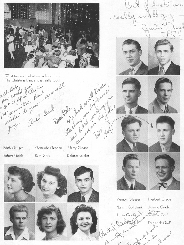 1943 Sheboygan Central High School, Page 74: Edith Gauger, Robert Geidel, Gertrude Gephart, Ruth Gerk, Jerry Gibson, Delores Giefer, Vernon Glaeser, Lewis Golichnik, Julian Govek, Forrest Grade, Herbert Grade, Jerome Grade, William Graf, Frederick Graff.