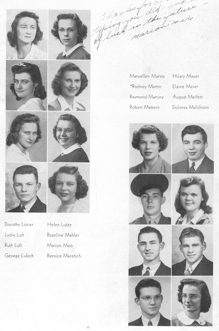 1943 Sheboygan Central High School, Page 81: Dorothy Lorier, Lydia Luft, Ruth Luft, George Lukich, Helen Lutze, Roseline Mahler, Marion Mais, Bernice Maretich, Maryellen Martin, Rodney Martin, Raymond Martiny, Robert Mattern, Hilary Mayer, Elaine Meier, August Meifert, Dolores Melchiors.