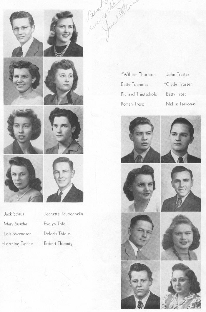 1943 Sheboygan Central High School, Page 89: Jack Straus, Mary Suscha, Lois Swendsen, Lorraine Tasche, Jeanette Taubenheim, Evelyn Thiel, Deloris Thiele, Robert Thimmig, William Thornton, Betty Toennies, Richard Trautschold, Roman Tresp, John Trester, Clyde Trossen, Betty Trost, Nellie Tsakonas.