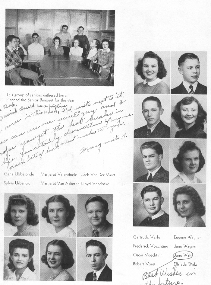 1943 Sheboygan Central High School, Page 90: Gene Ubbelohde, Sylvia Urbancic, Margaret Valentincic, Margaret Van Akkeren, Jack Van Der Vaart, Lloyd Vandoske, Gertrude Verle, Frederick Voechting, Oscar Voechting, Robert Voigt, Eugene Wagner, Jane Wagner, June Walt, Elfrieda Walz.
