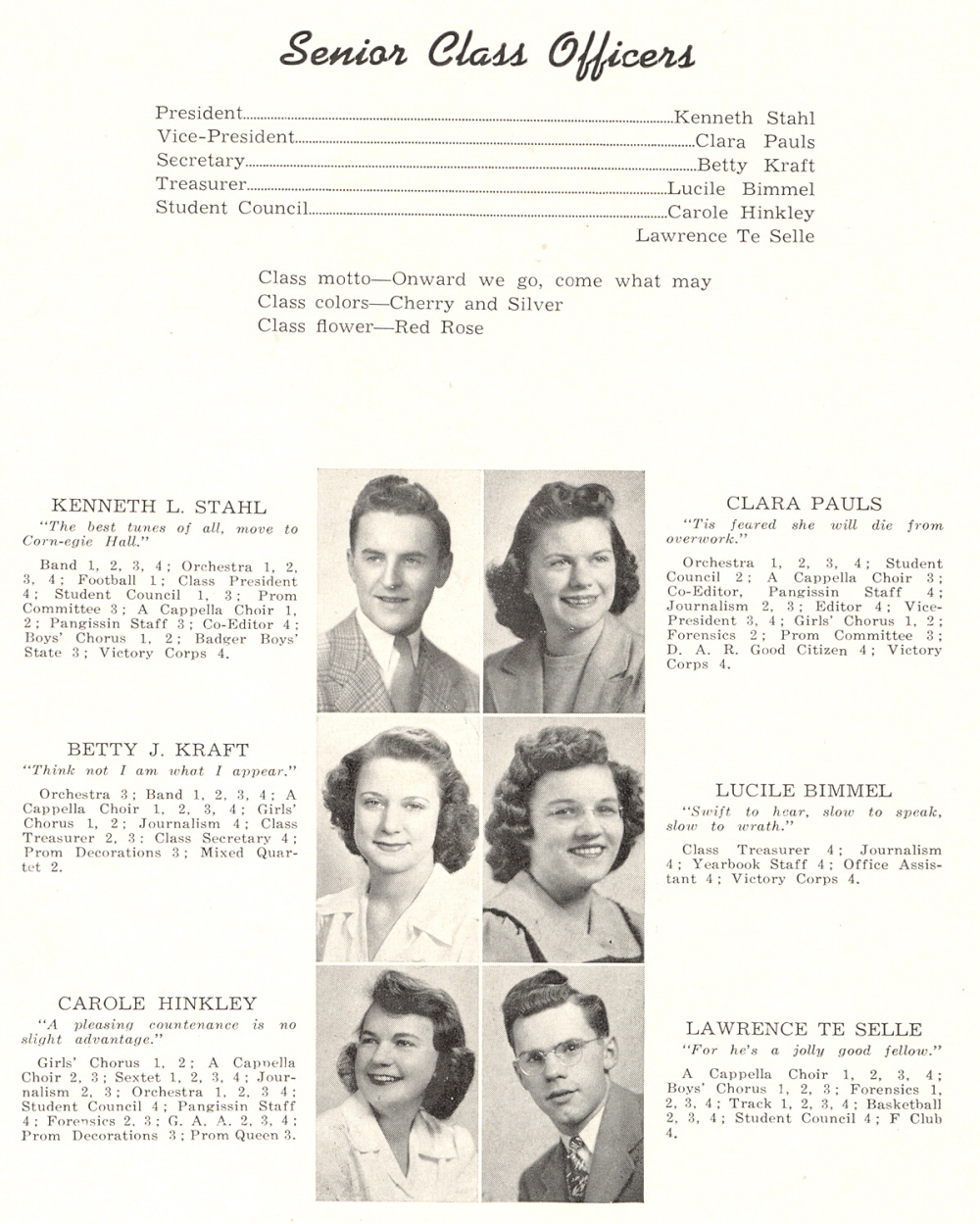 1943 Sheboygan Falls High School, Page 14: Kenneth Stahl, Clara Pauls, Betty Kraft, Lucile Bimmel, Carole Hinkley, Lawrence Te Selle.