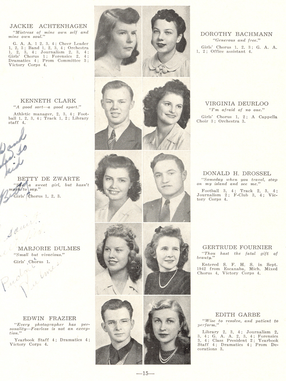 1943 Sheboygan Falls High School, Page 15: Jackie Achtenhagen, Dorothy Bachmann, Kenneth Clark, Virginia Deurloo, Betty De Zwarte, Donald Drossel, Marjorie Dulmes, Gertrude Fournier, Edwin Frazier, Edith Garbe.