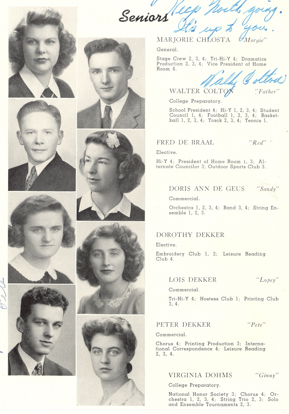1943 Sheboygan North High School, Page 64: Marjorie Chlosta, Walter Colton, Fred De Braal, Doris Ann De Geus, Dorothy Dekker, Lois Dekker, Peter Dekker, Virginia Dohms.