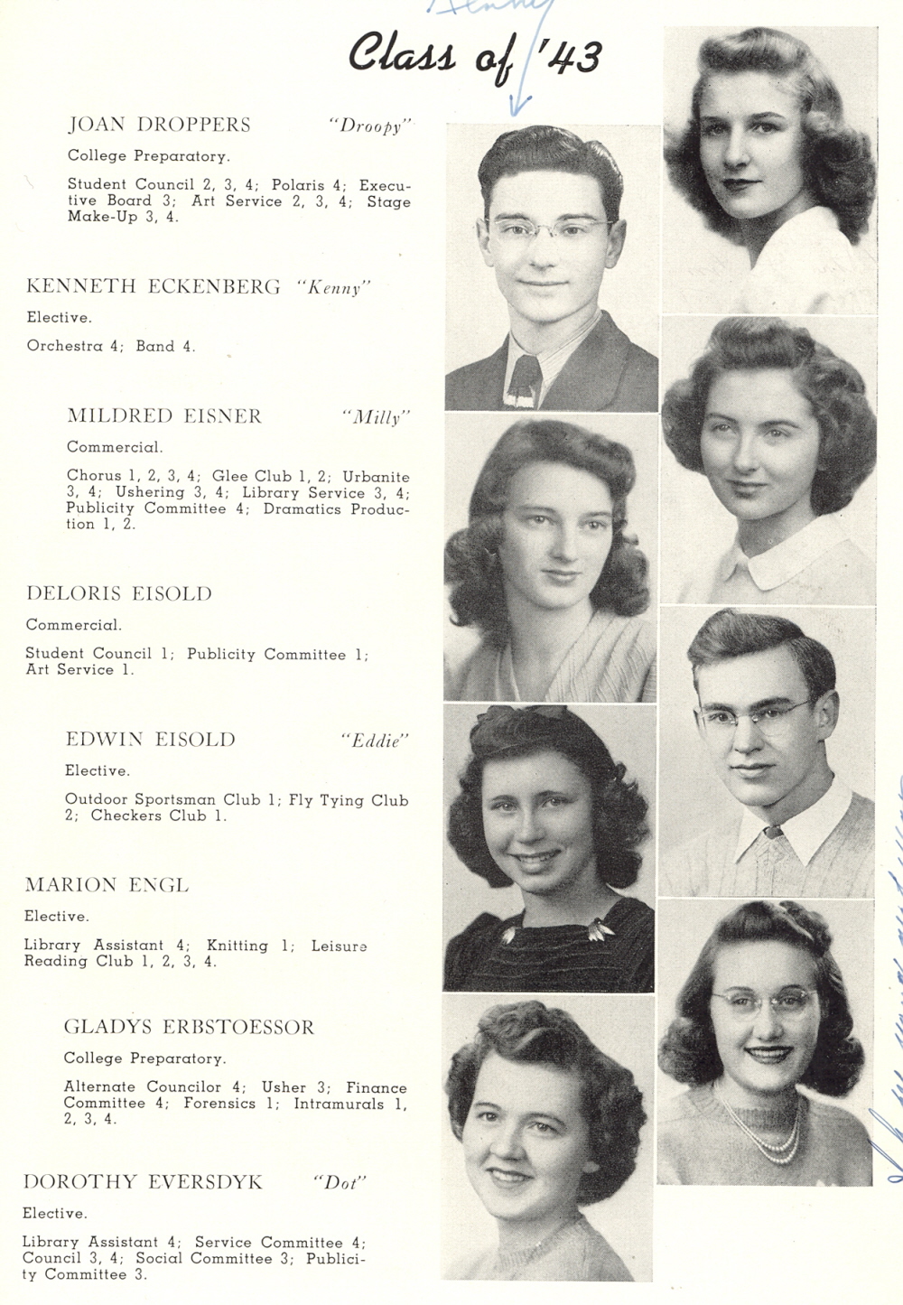 1943 Sheboygan North High School, Page 65: Joan Droppers, Kenneth Eckenberg, Mildred Eisner, Deloris Eisold, Edwin Eisold, Marion Engl, Gladys Erbstoesser, Dorothy Eversdyk.