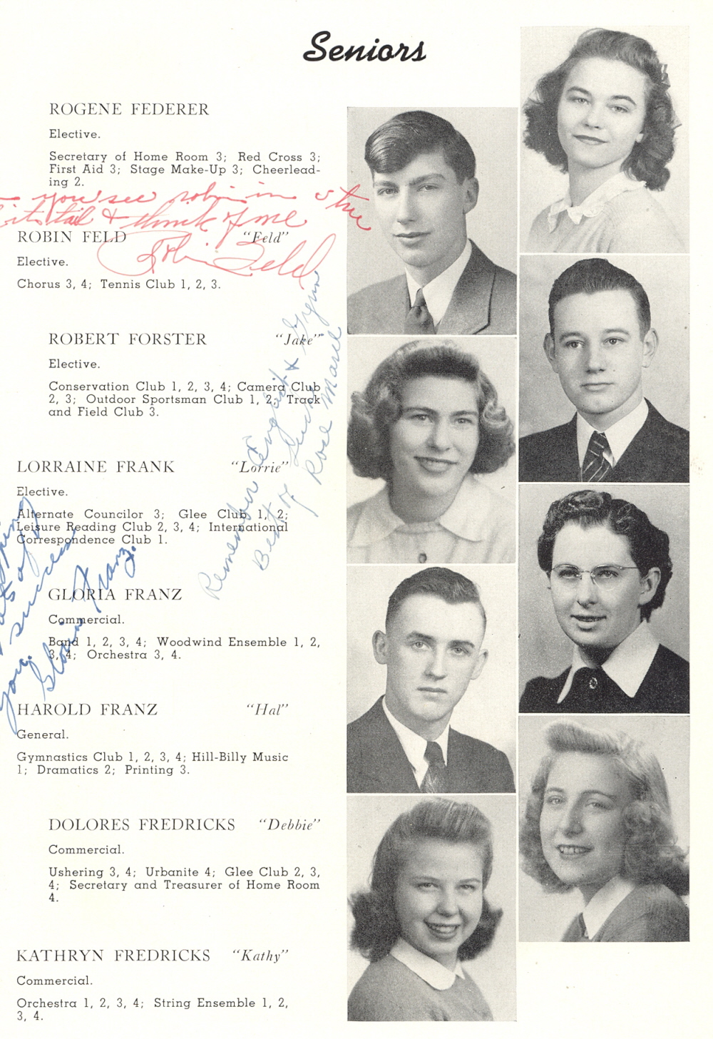 1943 Sheboygan North High School, Page 66: Rogene Federer, Robin Feld, Robert Forster, Lorraine Frank, Gloria Franz, Harold Franz, Dolores Fredricks, Kathryn Fredricks.