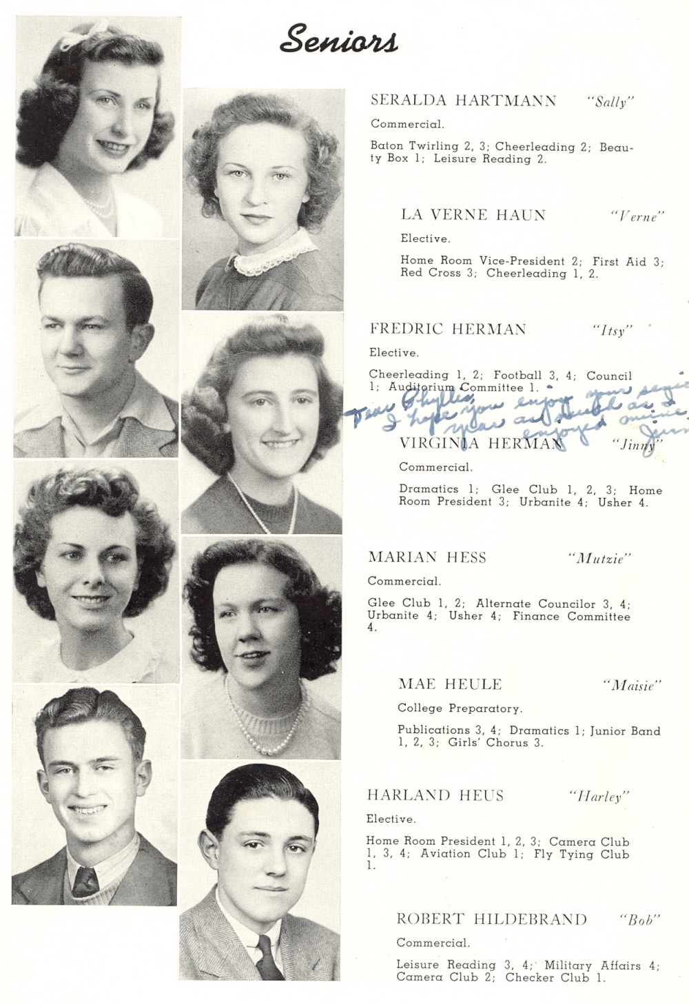 1943 Sheboygan North High School, Page 68: Seralda Hartmann, La Verne Haun, Fredric Herman, Virginia Herman, Marian Hess, Mae Heule, Harland Heus, Robert Hildebrand.