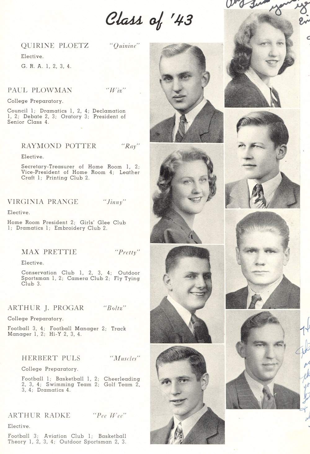 1943 Sheboygan North High School, Page 77: Quirine Ploetz, Paul Plowman, Raymond Potter, Virginia Prange, Max Prettie, Arthur J. Progar, Herbert Puls, Arthur Radke.