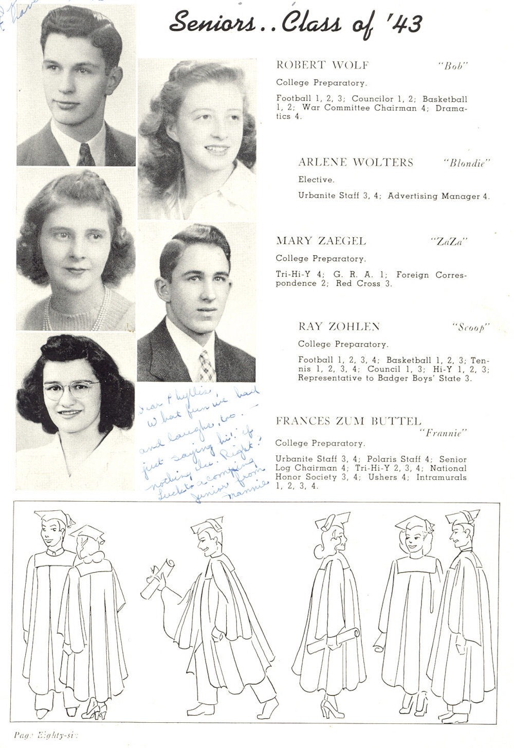 1943 Sheboygan North High School, Page 86: Robert Wolf, Arlene Wolters, Mary Zaegel, Ray Zohlen, Frances Zum Buttel.