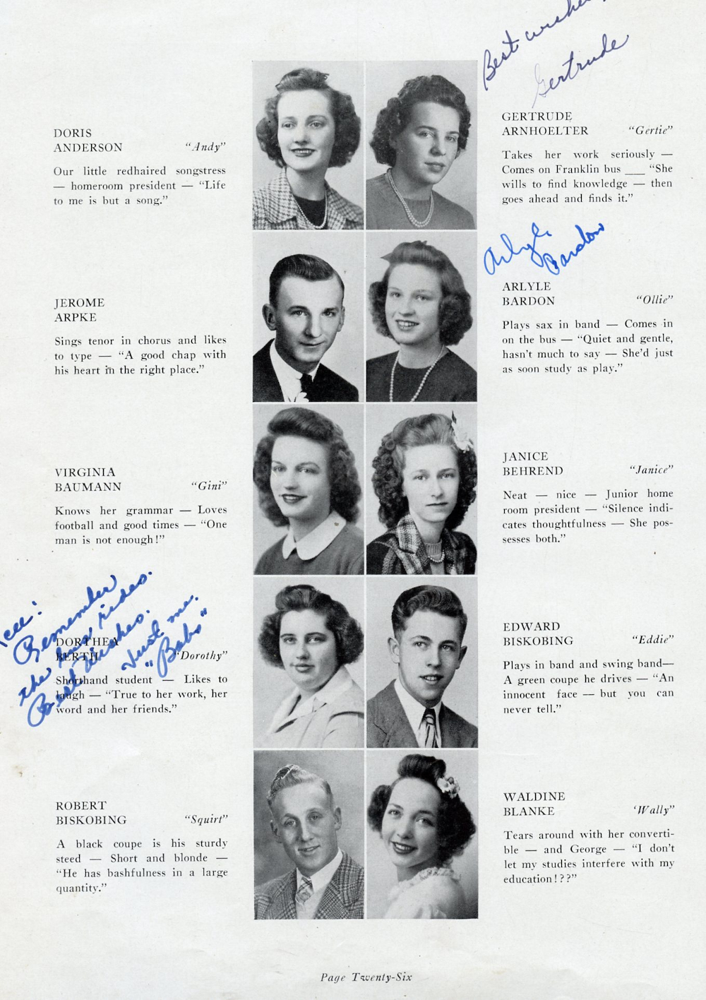 1944 Plymouth High School Yearbook Page 26: Doris Anderson, Gertrude Arnhoelter, Jerome Arpke, Arlyle Bardon, Virginia Baumann, Janice Behrend, Dorthea Berth, Edward Biskobing, Robert Biskobing, Waldine Blanke.