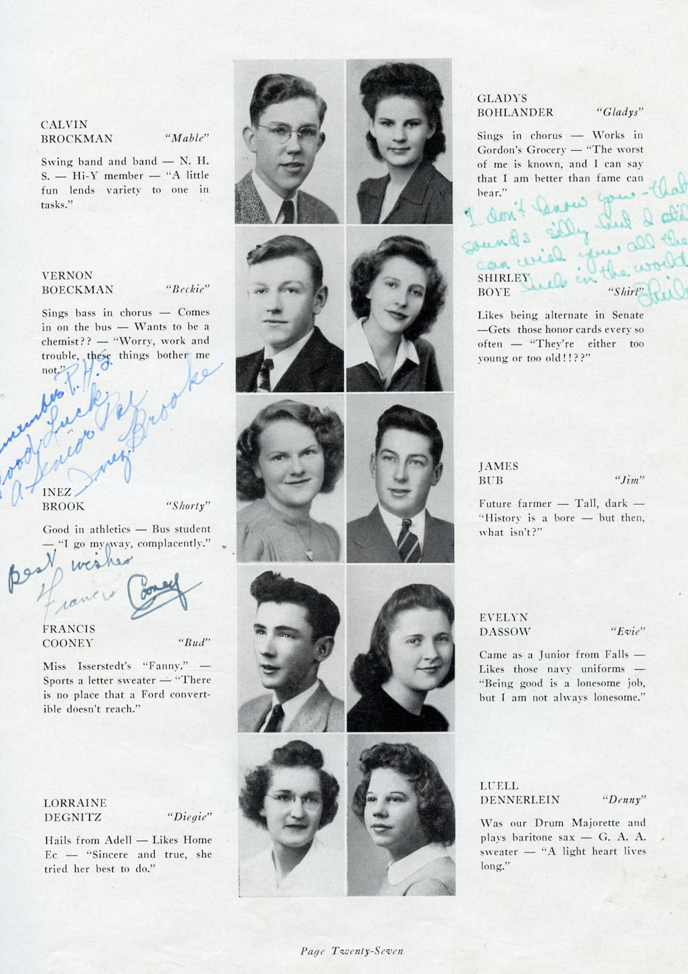 1944 Plymouth High School Page 27: Calvin Brockman, Gladys Bohlander, Vernon Boeckman, Shirley Boye, Inez Brook, James Bub, Francis Cooney, Evelyn Dassow, Lorraine Degnitz, Luell Dennerlein.