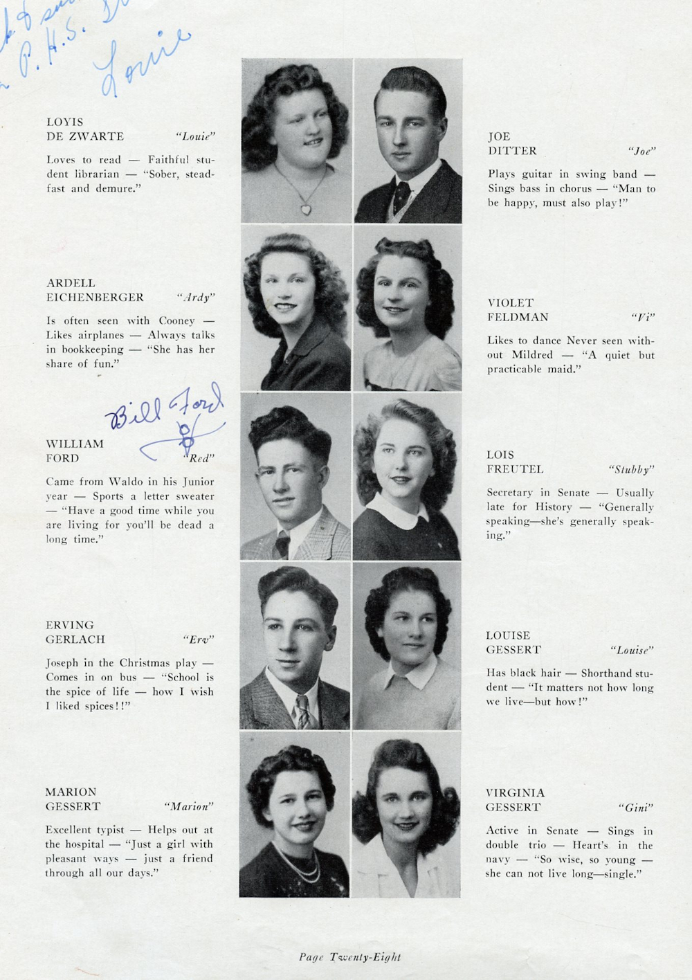 1944 Plymouth High School Page 28: Loyis De Zwarte, Joe Ditter, Ardell Eichenberger, Violet Feldman, William Ford, Lois Fruetel, Erving Gerlach, Louise Gessert, Marion Gessert, Virginia Gessert.