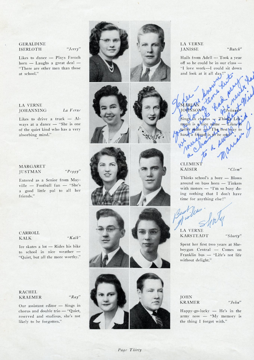 1944 Plymouth High School Page 30: Geraldine Iserloth, La Verne Janisse, La Verne Johanning, Marian Johnson, Margaret Justman, Clement Kaiser, Carroll Kalk, La Verne Karsteadt, Rachel Kraemer, John Kramer.