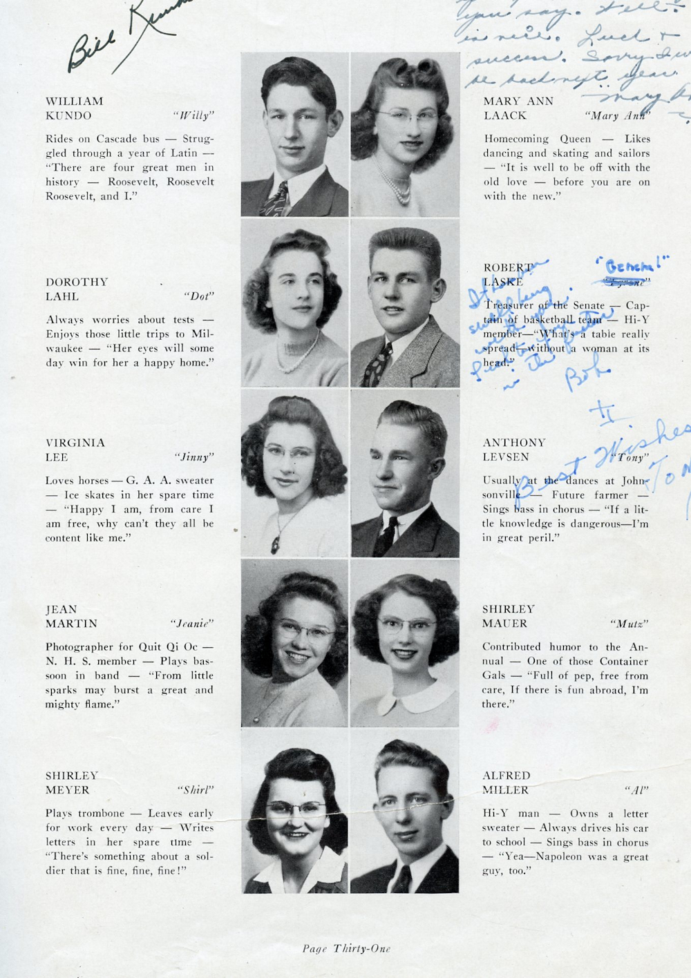 1944 Plymouth High School Page 31: William Kundo, Mary Ann Laack, Dorothy Lahl, Robert Laske, Virginia Lee, Anthony Levsen, Jean Mratin, Shirley Mauer, Shirley Meyer, Alfred Miller.
